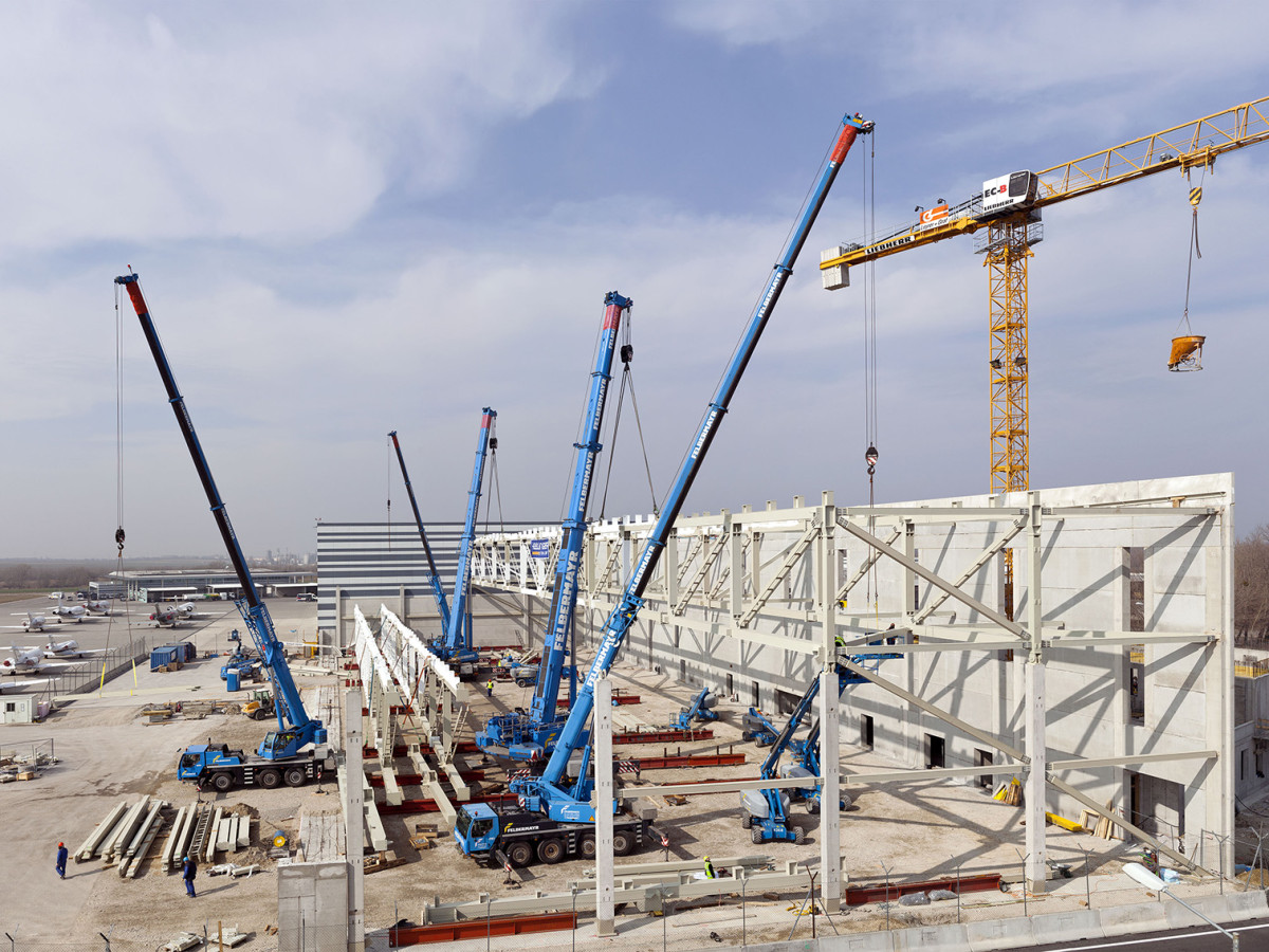 Mit fünf Liebherr-Mobilkranen hat die Unternehmensgruppe Felbermayr am Wiener Flughafen Schwechat die Stahlkonstruktion eines neuen Hangars errichtet. Das schwerste Einzelteil dabei wog 190 Tonnen - ein giganti-scher Fachwerk-Querträger mit einer Länge von hundert Metern.-------------------------Der Flughafen Schwechat im Osten Wiens bekommt derzeit eine neue Wartungshalle für Business-Jets. Die Arbeiten am mächtigen Fachwerk dafür hat der österreichische Kran- und Schwerlastdienstleister Felbermayr ausgeführt. Fünf Liebherr-Mobilkrane bauten in Team-Arbeit die 100 Meter überspannende Konstruktion auf. Die Hauptrolle dabei spielten ein LTM 1400-7.1 sowie ein LTM 1350-6.1. Im Tandemhub setzten die zwei Autokrane die bis zu 190 Tonnen schweren und 101 Meter langen Fachwerk-Träger der künftigen Flugzeughalle. Die drei kleineren Liebherr-Mobilkrane wurden zur Andienung und Installation der Quer- und Verbindungselemente eingesetzt. Insgesamt 800 Tonnen Stahl wurden für das Fachwerk des künftigen Hangars verbaut. Rund 2.800 Mitarbeiter zählt der Felbermayr-Konzern aktuell. Transport, Hebetechnik und Bau samt Abfallwirtschaft umfasst das große Repertoire des in Wels beheimateten Unternehmens. Die Kransparte ist dabei eines der Herzstücke der Firma, sind doch rund 400 Mobilkrane und 35 Raupenkrane europaweit im Einsatz. Der Großteil dieses beeindruckenden Fuhrparks stammt aus den Liebherr-Kranfabriken in Ehingen und Nenzing.------------------------ Während der letzten zwei Jahrzehnte hat Felbermayr mit seinen blau lackierten Geräten auch immer weiter nach Os-ten expandiert. Dependancen finden sich in zahlreichen osteuropäischen Ländern. Allein in Rumänien werden sieben Niederlassungen unterhalten. In einer Raffinerie unweit der Hauptstadt Bukarest kommt derzeit der neue Liebherr-Raupenkran LR 11000 beim Einbau eines 300 Tonnen schweren Reaktors zum Einsatz. Fast zeitgleich mit dem brandneuen 1000-Tonnen-Kran hat Felbermayr bei Liebherr in Ehingen noch drei große Raupenkrane vom Typ LR 1750 geordert.