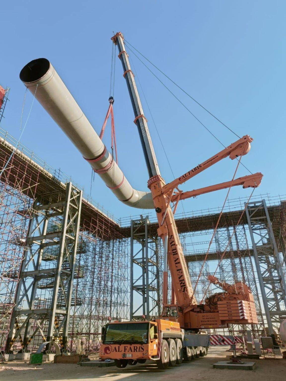 Al Faris führte einen kontrollierten Hub mit einem Mobilkran der 500-Tonnen-Klasse, einem Liebherr LTM 1500-8.1, durch und positionierte dabei sicher ein großes Pipeline-Segment innerhalb eines dichten Tragwerks. Der Einsatz erforderte eine sorgfältige Hubplanung, präzise Anschlagtechnik sowie eine koordinierte Ausführung, um die Last innerhalb einer beengten Gerüstkonstruktion zu manövrieren. Bereitstellung technisch geplanter Hebelösungen für komplexe Industrieprojekte in ganz Saudi-Arabien.
