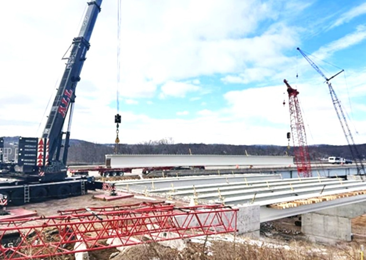 Ein großes Brückenneubauprojekt entlang des I-39/90/94-Korridors in Wisconsin, USA, schreitet mit Unterstützung eines koordinierten Kraneinsatzes voran, an dem sowohl Raupen- als auch Geländekrane beteiligt sind. Das Verkehrsministerium von Wisconsin (WisDOT) bezeichnet das Projekt – das sich über eine 108 Kilometer lange Strecke zwischen Madison und Portage erstreckt – als komplex. Die Arbeiten konzentrieren sich auf den Ersatz von Brücken über den Wisconsin River im Columbia County, die ursprünglich 1961 erbaut wurden. Um den Verkehrsfluss während der Bauarbeiten aufrechtzuerhalten, werden neben den bestehenden Brücken neue Bauwerke errichtet. WisDOT hat den Auftrag an Kraemer North America vergeben, die bis zu sieben Raupenkrane vor Ort einsetzt. Für eine kritische Anfangsphase beauftragte Kraemer Dawes Rigging & Crane Rental, ein Unternehmen der ALL-Gruppe, mit der Bereitstellung einer Geländekranlösung. Geländekran unterstützt effiziente Trägerinstallation Dawes lieferte einen 550-Tonnen-Liebherr-LTM-1450-8.1-Geländekran, der auf einem neu errichteten Widerlager für die erste Brücke positioniert wurde. Der Kran unterstützte einen Raupenkran bei der Durchführung mehrerer Doppelhubvorgänge zur Montage der Betonbalken. Die Raupenkrane operieren von einem provisorischen Damm aus, der unterhalb der Brückenbaustelle, etwa 20 Meter unterhalb der endgültigen Brückenhöhe, errichtet wurde. Diese Anordnung ermöglicht einen sicheren Betrieb, schränkt jedoch die Positionierungsmöglichkeiten für bestimmte Hebevorgänge ein.---------------------------------- Der Einsatz eines Geländekrans direkt am Widerlager verkürzte die Rüstzeiten und machte die für Raupenkrane erforderlichen aufwendigen Bodenschutzmaßnahmen überflüssig. Der Mobilkran wurde vor Ort montiert und innerhalb kürzester Zeit betriebsbereit gemacht.------------------------------------- Komplexe Logistik und Schwerlasttransporte Die Montage der Träger erforderte eine präzise Koordination. Jeder der neun Betonträger wog etwa 65 Tonnen und war 42,7 Meter lang. Die Träger wurden von einer gesperrten Fahrspur der bestehenden Brücke aus angehoben. Beim gleichzeitigen Anheben der Träger bediente ein Geländekran jeweils ein Ende, während ein Raupenkran das andere Ende übernahm. Die Krane arbeiteten im Tandem, wobei der Geländekran mit einem Radius von 21 Metern (70 Fuß) operierte und über einen 31,7 Meter (104 Fuß) langen Ausleger sowie ein Gegengewicht von 104 Tonnen (229.300 Pfund) verfügte.------------------------------------ Die Logistik vor Ort stellte zusätzliche Herausforderungen dar. Begrenzter Platz und Fahrbahnsperrungen erforderten angepasste Lieferverfahren für Krankomponenten, einschließlich Gegengewichte.---------------------------------- Projektfortschritt Alle neun Träger für den ersten Brückenabschnitt wurden an einem verlängerten Arbeitstag montiert. Dieser Vorgang stellt einen wichtigen Meilenstein in einem umfassenderen Infrastrukturprojekt zur Modernisierung wichtiger Fernstraßenverbindungen in der Region dar.