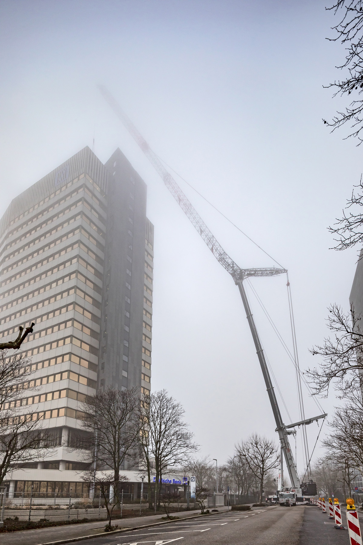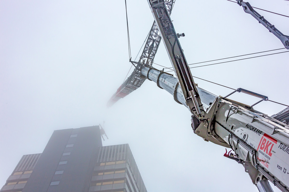 24-t-Derrickkran musste auf dem Dach eines 94 m hohen Bankgebäudes vor den Toren Frankfurts montiert werden 48-Stunden-Zeitfenster erforderte einen schnellen und flexiblen Auf- und Abbau des Krans Kompakter 400-t-Mobilkran punktete mit schnellem, selbstrüstendem Mega-Wing-Lift-Abspannsystem, leichten Komponenten und einfacher Bedienung Die Kranspezialisten der BKL Baukran Logistik haben mit ihrem Grove GMK6400 Teile eines 24-t-Derrickkrans auf das Dach eines 94 m hohen Bankgebäudes in Eschborn im Nordwesten Frankfurts gehoben. Dort soll der Derrickkran für eine Dachsanierung eingesetzt werden. BKL zählt mit über 460 Bau- und Autokranen zu den größten Full-Service-Anbietern für Kranlösungen in Europa. Der Frankfurter BKL Standort erhielt den Auftrag für das ambitionierte Projekt, da er neben seiner Autokranexpertise auch über viel Erfahrung in der Montage von Baukranen verfügt. Edwin Weidner, Leiter der Autokranabteilung bei BKL in Frankfurt, leitete das gesamte Projekt, das von einem siebenköpfigen Team umgesetzt wurde. „Montagen in dieser Höhe sind eine Herausforderung, besonders bei winterlichen Wetterbedingungen. Aber wir arbeiten aufgrund der lokalen Architektur häufig in Höhen und bei beengten Platzverhältnissen und konnten unseren Kunden eine ausgeklügelte Autokranlösung bieten“, sagte Weidner. „Bei diesem Projekt hatte unser Kunde nur 48 Stunden Zeit, um einen Derrickkran zu montieren. Innerhalb des Zeitfensters musste auch unser Autokran auf- und abgebaut sein, da die Parksituation rund um das Gebäude keine anderen Möglichkeiten zuließ Meterlange Wippspitze aus einzelnen Gitterelementen, sowie 115 Tonnen Ballastgewichten. Außerdem verfügt der GMK6400 über einen geringen Schwenkradius und lässt sich einfach bedienen.“ Der GMK6400 hob die einzelnen Teile des Derrickkrans auf das Dach, wo er anschließend montiert wurde: zunächst die Stahlunterkonstruktion und dann die einzelnen Kranelemente. Dabei musste der GMK6400 eine Höhe von 131 m und eine Ausladung von 43 m erreichen, um die bis zu 7 t schweren Teile an ihren Bestimmungsort zu heben. BKL verfügt über fast 50 Jahre Erfahrung im Verkauf und in der Vermietung von Kranen und Serviceleistungen. Der GMK6400 ergänzt seit August 2017 die Flotte in Frankfurt und ist seitdem schnell ununterbrochen im Einsatz. Er ist mit einer Hubleistung von 400 Tonnen der weltweit stärkste 6-Achsen-Mobilkran und verfügt über das selbstrüstende, tragfähigkeitssteigernde Abspannsystem Mega-Wing-Lift. Der Hauptausleger am GMK6400 ist 60 m lang. In Kombination mit der Wippspitze kann der Kran Lasten heben, die derzeit von keinem anderen sechs- oder gar siebenachsigen Kran erreicht werden. Außerdem wird sowohl der Unterwagen als auch der Kranaufbau von nur einem leistungsstarken Motor angetrieben, was das Gesamtgewicht des Krans und seinen Kraftstoffverbrauch reduziert. Neben dem GMK6400 hat BKL auch einen GMK6300L und einen weiteren GMK5250L in der Flotte, die bei BKL Frankfurt und an BKL Standorten in Deutschland regelmäßig im Einsatz sind.