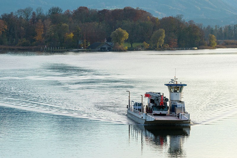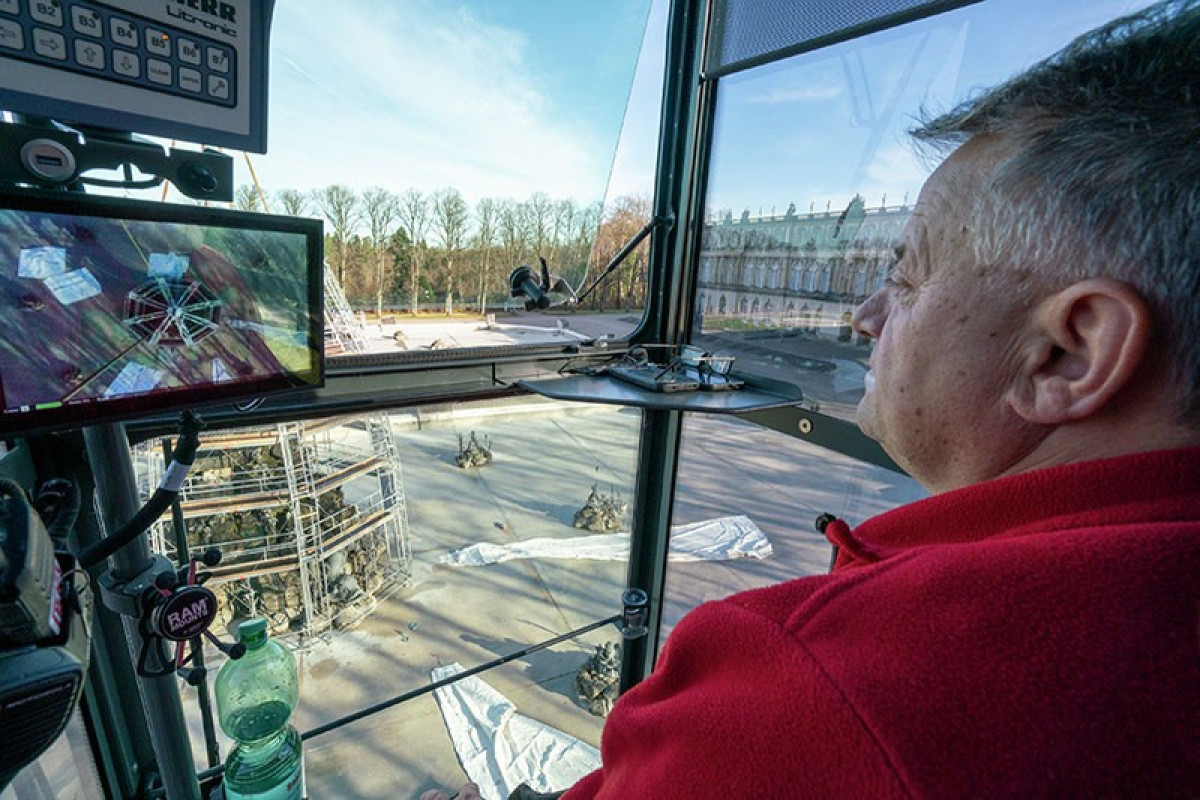 BKL setzt mit Mobilbaukran MK 88-4.1E große Gerüstteile über historische Brunnen Präzises Navigieren durch Katzfahrt am steilgestellten Ausleger Krantransport per Lastenfähre auf die größte Chiemsee-Insel Kurz vor dem Wintereinbruch beginnt im Schlossgarten auf der Herreninsel im bayerischen Chiemsee alljährlich ein besonderes Arbeitsprogramm: Dann werden die monumentalen Figurenbrunnen der Parkanlage für die kalte Jahreszeit vorbereitet. Damit Frost und Schnee den historischen Brunnen nichts anhaben können, erhalten sie schützende Gerüsthauben mit wetterfesten Planen. Im Frühjahr werden diese Einhausungen wieder entfernt, sodass die Wasserspiele rechtzeitig zur neuen Besuchersaison wieder in Betrieb gehen können. Für die Montage dieser Schutzhülle kam im letzten Herbst ein Liebherr MK 88-4.1E zum Einsatz. Der Mobilbaukran wurde von der BKL Baukran Logistik GmbH auf die Insel gebracht – ein Einsatz mit ungewöhnlicher Anreise. --------------------------------Nicht alle Fahrten zu Baustellen sind für Kranfahrer so romantisch wie die Anreise zur größten Insel im bayerischen Chiemsee. Bereits lange vor Sonnenaufgang traf der vierachsige Mobilbaukran von BKL am Schiffsanleger ein, um mit der ersten Fahrt der Lastenfähre auf die Herreninsel übergesetzt zu werden. Nach der kurzen Überfahrt ging es über die Insel weiter zum Park des vom bayerischen Regenten Ludwig II. errichteten Schlosses. Vor der Kulisse von Schloss Herrenchiemsee warteten die Gerüstbauer bereits mit vormontierten Bauteilen auf den Liebherr-Kran. Dass für diese Arbeiten ein MK-Mobilbaukran eingesetzt wurde, hat einen guten Grund. Christian Hofmann, Projektleiter beim Gerüstbauunternehmen Westermaier GmbH, erläutert: „Gegenüber einem kleinen Mobilkran bietet uns der MK 88-4.1E eine deutlich größere Hakenhöhe. In Kombination mit der Katzfahrt am Ausleger lassen sich die Gerüstteile präzise über die bis zu 13 Meter hohen und empfindlichen Figurenbrunnen hinweg absenken und an langen Anschlagseilen noch leichter navigieren als mit einem klassischen, wippenden Teleskopausleger.“ Hakenhöhe bis 59 Meter möglich----------------------- Eingehaust wurden die beiden großen Figurenbrunnen mitten in den großen, trockengelegten Wasserbassins im prächtigen Park. Die Kranstellflächen außerhalb dieser Brunnenanlagen erforderten eine Ausladung von rund 25 Metern. Kein Problem für den MK 88-4.1E mit seinem 45 Meter langen, zusammenfaltbaren Horizontalausleger, der über verschiedene Steilstellungen Hakenhöhen bis über 59 Metern erreichen kann. Ausreichend Spielraum also für die Montage der großformatigen Bauteile.---------------------------- Zwischen den beiden Brunnenanlagen wurde der Kran einmal umpositioniert. Der Standortwechsel, den der kundige MK-Fahrer von BKL routiniert umsetzte, dauerte nur rund eine halbe Stunde. Anschließend war der Mobilbaukran wieder einsatzbereit aufgebaut und die Arbeiten am nächsten Brunnen konnten beginnen. Nachdem die Gerüstkonstruktionen jeweils montiert waren, hob der Kran die großflächigen Kunststoffplanen an ihren Platz. An der Außenseite der Gerüstkuppeln befestigt, schützen sie die historischen Figuren und die Technik der Brunnenanlage während der Wintermonate zuverlässig vor Witterungseinflüssen.--------------------------------- Für das präzise Positionieren der Lasten erwies sich die hochgefahrene Kabine des MK 88-4.1E als besonders hilfreich. Aus rund 20 Metern Höhe hatte Kranfahrer Drago beste Sicht auf die arbeitenden Gerüstbauer – und zugleich auf die prächtige Fassade von Schloss Herrenchiemsee. Zusätzlich unterstützte ihn die an der Laufkatze befestigte Hakenkamera, die den senkrechten Blick auf Hakenflasche und Last direkt auf den Monitor in der Kabine übertrug. So konnten die Bauteile zentimetergenau nach den Anweisungen der Monteure geführt werden.------------------------------------ Am späten Nachmittag waren die Arbeiten abgeschlossen und die beiden großen Brunnenanlagen vollständig winterfest eingepackt. Nach dem vollautomatisierten Zusammenklappen des Auslegers trat der Mobilbaukran seinen Rückweg zum BKL-Standort an. Wie bereits am frühen Morgen verließ der Liebherr MK 88-4.1E die Herreninsel per Lastenfähre und machte sich über den Chiemsee auf die kurze Seereise zurück zum Festland.