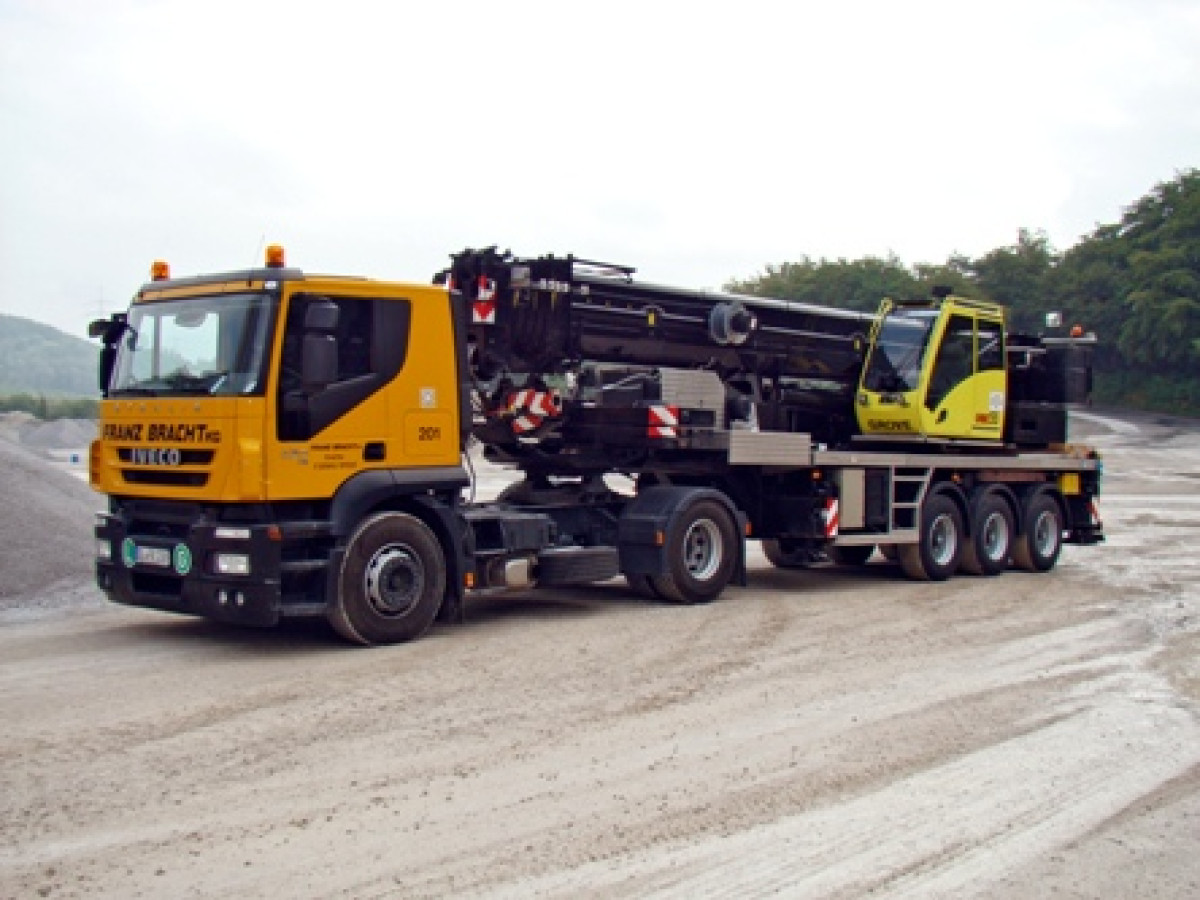 Ein Grove GSK55-Anhängerkran wurde kürzlich in einem abgelegenen Bergdorf in Deutschland eingesetzt. Der Kranführer erklärte, der GSK55 habe die Bergstraßen problemlos bewältigt, die gleiche Fahrt wäre mit einem herkömmlichen Geländekran jedoch deutlich langsamer gewesen. Der GSK55 mit 55 Tonnen Tragfähigkeit ist ein auf einem Anhänger montierter Geländewagen, der von jedem Standard-Lkw gezogen werden kann. In diesem Fall handelte es sich um einen Iveco Stralis mit 4x2-Antrieb und einem 309 kW starken Motor. Der Kran fuhr zu einem Sinterwerk in Mensinghausen, um dort im Rahmen eines Reparaturprojekts mehrere Hebevorgänge durchzuführen. Mensinghausen ist ein kleines Dorf im Rothaargebirge, dessen Gipfel 843 m über dem Meeresspiegel liegt. Dirk Bracht, Geschäftsführer der Franz Bracht KG, die den GSK55 für den Einsatz lieferte, sagte, sein Unternehmen habe sich für den Kran entschieden, weil für dessen Konstruktion im Gegensatz zu anderen Kranen keine Sondergenehmigungen für die Anfahrt zum Einsatzort erforderlich seien. „Bei diesem Auftrag lag die Schwierigkeit nicht unbedingt im Heben selbst, sondern darin, den Kran so schnell und kostengünstig wie möglich zur Baustelle zu bringen“, sagte er. „Wir fuhren mit dem Kran über kurvenreiche, enge Straßen, die ein Geländewagen nur schwer bewältigen konnte und für die zudem eine Sondergenehmigung erforderlich gewesen wäre. Da der GSK55 wie ein normaler Lkw fahren kann, erreichten wir die Baustelle problemlos, und er erledigte die Arbeit mühelos.“ Der GSK55 bietet dank einer unabhängig lenkbaren dritten Achse und einer einziehbaren ersten Achse eine gute Manövrierfähigkeit. Franz Bracht KG konnte zudem das Gegengewicht des Krans direkt am Schwanenhals positionieren – eine kürzlich erfolgte Konstruktionsverbesserung, die die Traktion der Reifen optimiert. Mit einem Gegengewicht von 10,6 t hob der Kran Lasten bis zu 3 t in einem Radius von 15 m bei einer Auslegerlänge von 35,77 m. Die Arbeiten dauerten vier Tage. Der Kranführer fuhr täglich mit dem Lkw nach Hause, sodass der Kran auf der Baustelle verblieb und kein alternativer Transport nötig war. Am Ende des Einsatzes hatte der Kran nur 20 Prozent seines Treibstoffs verbraucht. Der GSK55 nahm Anfang August seinen Dienst bei Franz Bracht KG auf und wurde direkt zum Projekt in Mensinghausen gebracht. Er verfügt über die gleichen Hubkapazitäten wie der Grove GMK3055 All-Terrain-Kran, auf dem er basiert. Er ist auf einem speziell entwickelten Fahrgestell montiert, das als Standardanhänger dient und so den Wendekreis des Krans verbessert und die Betriebskosten senkt. Der 55-Tonnen-Kran besitzt einen 43 m langen Teleskopausleger mit optionalem 8,7–15 m Schwenkausleger, wodurch die maximale Hubhöhe auf 60 m erhöht wird. Die Franz Bracht KG mit Sitz in Erwitte, Norddeutschland, ist eines der größten Kranverleihunternehmen Deutschlands. Sie verfügt über mehr als 40 Jahre Erfahrung und 200 Krane in ihrer Flotte. Das Unternehmen testete den GSK55 im Rahmen einer Testfahrt durch Deutschland, die von der Manitowoc-Niederlassung KranAgentur Werner organisiert wurde.