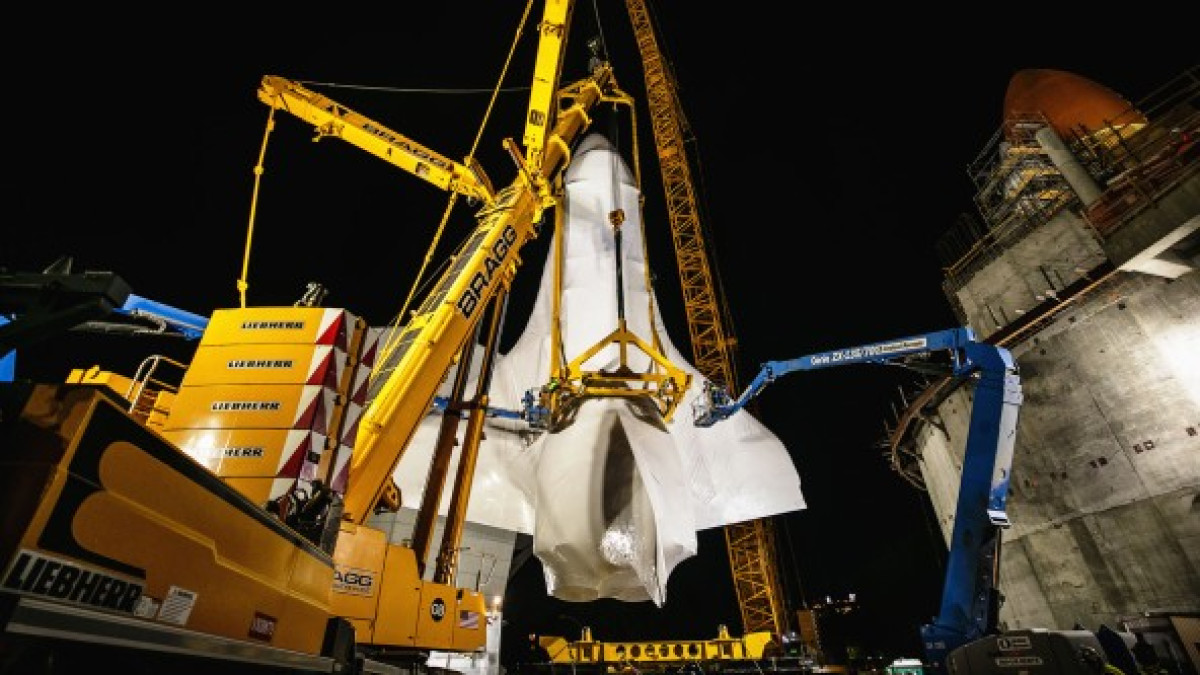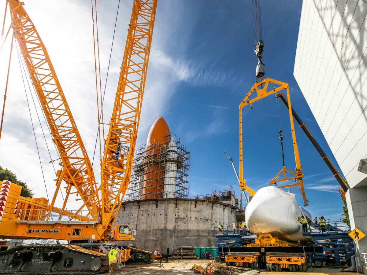 Start in Los Angeles Die Fähigkeit des Liebherr LR 1750, Hub- und Schwenkgeschwindigkeit elektronisch zu begrenzen, war aufgrund der extrem engen Toleranzen in der Grube und der konstanten Windgeschwindigkeiten in der Hubhöhe entscheidend für den Erfolg der Hebevorgänge. Beim Transport unschätzbarer NASA-Exponate wie der Endeavour und ihrer zugehörigen Ausrüstung ist es beruhigend zu wissen, dass man sich auf die Qualität, Effizienz und Präzision eines Liebherr-Produkts verlassen kann. Justin Lambert, Geschäftsführer von Bragg Crane & RiggingUm eine realitätsnahe Startposition zu simulieren, stapeln die Bragg Companies mithilfe mehrerer Liebherr-Krane alle flugzertifizierten Komponenten des 20-stöckigen Space Shuttles Endeavour im Samuel Oschin Air and Space Center innerhalb des California Science Center. Dies ist das weltweit einzige authentische Space-Shuttle-System, das in Startkonfiguration ausgestellt ist. Das Space Shuttle Endeavour absolvierte 25 Missionen und begeisterte seit seiner Ankunft im California Science Center im Oktober 2012 rund 20 Millionen Besucher aus aller Welt. Der 37 Meter lange Orbiter wiegt 80.765 Kilogramm und hat eine Spannweite von 23,8 Metern. Mit über 6.000 Arbeitsstunden, darunter zwei Jahre Vorplanung und Hebeplanung, hat Bragg Companies den kompletten Aufbau des Space Shuttles Endeavour realisiert, um eine reale Startposition im neuen Samuel Oschin Air and Space Center zu simulieren . Das Oschin-Gebäude wurde bereits teilweise vor dem Aufbau aller Orbiter-Startkomponenten errichtet und wird um die aufgebaute Startsimulation herum fertiggestellt. Der komplette Raketenstapel umfasst das Space Shuttle Endeavour sowie zwei Feststoffraketenverstärker, die jeweils aus einer Heckverkleidung am unteren Ende, einem 35 Meter langen Feststoffraketenmotor und einer vorderen Baugruppe an der Spitze bestehen. Die größte Komponente des Stapels ist ein 47 Meter langer externer Treibstofftank. Der etwa sechsmonatige Montageprozess begann im Juli 2023 mit der Installation der Heckverkleidungen und wurde im Januar 2024 abgeschlossen. „Mit dem Anheben und Aufstellen der Endeavour haben wir die letzte Montage eines Space Shuttles erfolgreich abgeschlossen. Dies ist ein Traum, der über dreißig Jahre in der Entwicklung war, und eine Leistung, die zuvor noch nie außerhalb einer Einrichtung der NASA oder der Luftwaffe erreicht wurde“, erklärte Jeffrey Rudolph, Präsident und CEO des California Science Center.Den Shuttle einstellen Bragg setzte bei jedem Hub etwa fünf Krane ein. Der Liebherr LR 1750/2 Raupenkran war durchgehend vor Ort, und während des gesamten Projekts waren regelmäßig mehrere hydraulische LKW-Krane parallel im Einsatz, um verschiedene Aufgaben zu erfüllen. Der Liebherr LR 1750 Raupenkran hatte ein Gegengewicht von 665 Tonnen, eine Auslegerhöhe von ca. 120 Metern und einen maximalen Ausladungsradius von ca. 46 Metern. „Die Fähigkeit des Liebherr LR 1750, Hub- und Schwenkgeschwindigkeit elektronisch zu begrenzen, war aufgrund der extrem engen Toleranzen in der Grube und der konstanten Windgeschwindigkeiten in der Hubhöhe entscheidend für den Erfolg der Hebevorgänge“, erklärt Justin Lambert, Geschäftsführer von Bragg Crane & Rigging. „Beim Transport unschätzbarer NASA-Exponate wie der Endeavour und ihrer zugehörigen Ausrüstung ist es beruhigend zu wissen, dass man sich auf die Qualität, Effizienz und Präzision eines Liebherr-Produkts verlassen kann.“ Zum Auftakt des Montageprozesses verlud und transportierte Bragg die hinteren Raketenverkleidungen von Mojave, Kalifornien, nach Los Angeles, Kalifornien, und setzte anschließend den Liebherr-Raupenkran LR 1750 zum Anheben und Positionieren der Verkleidungen ein. Bragg Crane & Rigging nutzte dann den Raupenkran und den Liebherr-Mobilkran LTM 1160, um die Feststoffraketenmotoren anzuheben, aufzurichten und zu positionieren sowie den Außentank aufzurichten und in seine endgültige Position zu bringen. Das größte zu manövrierende Bauteil war der Orbiter Endeavour. Nach einem schwierigen Transportvorgang wurde die Endeavour mithilfe des Liebherr-Raupenkrans LR 1750 und der Mobilkrane Liebherr LTM 1400 und LTM 1160 angehoben, aufgerichtet und im neuen Gebäude des Samuel Oschin Air and Space Center platziert. Die größte Herausforderung beim Stapeln bestand darin, den Außentank an der Endeavour anzubringen. Das Platzieren des Tanks gestaltete sich schwierig, da er aufgrund seiner vollständig aus Schaumstoff bestehenden Außenhülle durch das Gerüst geführt werden musste, ohne dabei etwas zu berühren. Zusätzlich erschwerten die geringen Toleranzen der Verbindungsstellen zu den Feststoffraketenverstärkern das Anheben und Positionieren. Nach fast vierzehn Stunden Arbeit war die Endeavour vollständig vom Kran und der Hebevorrichtung getrennt, und die endgültige Verbindung des Space Shuttles mit dem Außentank und den beiden Feststoffraketenverstärkern war abgeschlossen.Hindernisse überwinden Ein Projekt dieser Größenordnung erfordert eine präzise Planung des Hebevorgangs Monate im Voraus. Für diesen Hebevorgang wurden rund zwanzig detaillierte Pläne erstellt und über 1.400 Arbeitsstunden investiert. Trotz sorgfältiger Planung musste Bragg jedoch zahlreiche Herausforderungen meistern, darunter beengte Arbeitsbereiche und schwierige Wetterbedingungen. Während der verschiedenen Hebevorgänge beeinträchtigten starker Wind und Regen das Team beim Einbringen der Bauteile in das neue Gebäude. Aufgrund der enormen Größe der Bauteile und ihrer großen Oberflächen mussten alle Hebevorgänge bei möglichst wenig Wind erfolgen. Da der Wind in den frühen Morgenstunden am geringsten war, arbeitete Bragg Crane & Rigging viele Nächte durch, um diese komplexen Hebevorgänge abzuschließen. Trotz dieser Herausforderungen wurde das Projekt ohne Erste-Hilfe-Einsätze, Zwischenfälle oder meldepflichtige Vorkommnisse abgeschlossen. Die Bragg Companies arbeiten nac