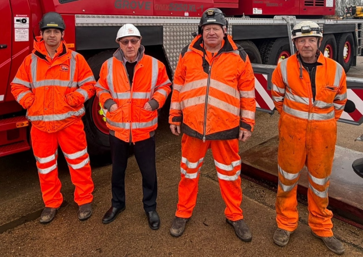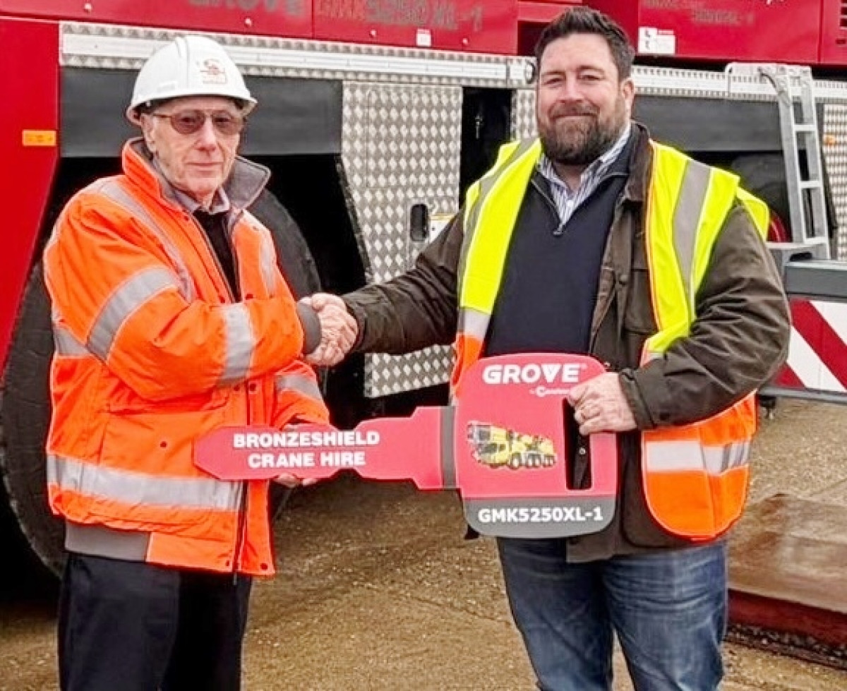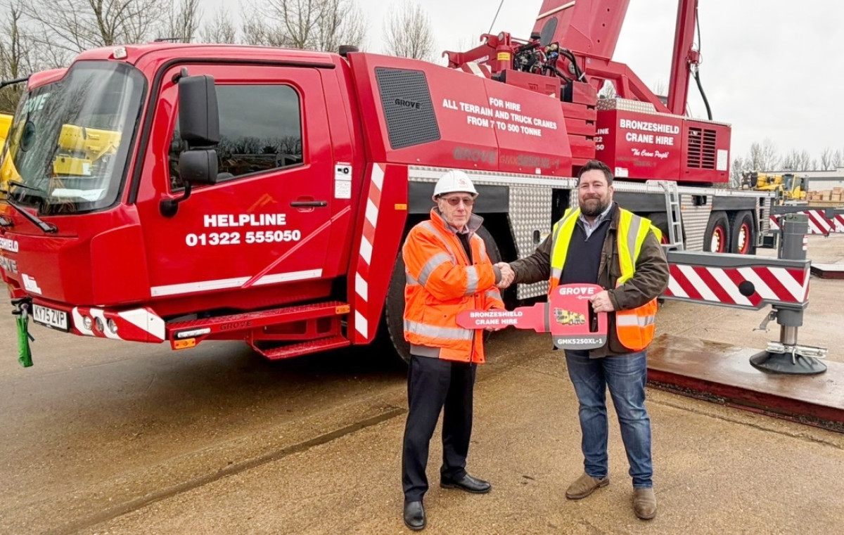 Bill Frost of Bronzeshield (L) with James Leishman of Grove/Manitowoc--------------------L-R) Brandon Selby, Bill Frost, Dean Philpot, and Chris Munns of Bronzeshield ----------------------------- UK-Vermietungsunternehmen Bronzeshield hat im Rahmen einer Flottenerneuerung eine Grove GMK5250XL-1 All-Terrain-Kran mit 250 Tonnen geliefert erhalten. Der neue Kran ergänzt zwei weitere Grove-Erweiterungen, den 300-Tonnen GMK6300L-1 und den kleineren 150-Tonnen GMK5150XL. Der GMK5250XL-1 verfügt über einen achtteiligen Hauptausleger von 78,5 Metern, ergänzt durch eine 18 Meter lange Bi-Fold-Swingaway-Verlängerung, die mit zusätzlichen Inserts auf bis zu 34 Meter verlängert werden kann. Zu den Funktionen gehören Groves Maxbase-variable Unterfahrwerk-Konfiguration und Allradlenkung. Die Leistung stammt von einem einzigen, HVO-fertigen Stage-V-Mercedes-Dieselmotor. Die Maschine ist außerdem mit einer Hilfsseilwinde für Einsätze bei Sonderprojekten mit einem ihrer Langzeitkunden, Simmons Industrial Services, sowie dem weiteren Kranunternehmen Lee Lifting, ausgestattet. Bronzeshield wurde 1971 von Bill Frost gegründet und hat seinen Sitz in der Nähe von Crayford, Kent, auf der Südostseite Londons. Frost gründete das Unternehmen mit einem Oberträgerkran und kaufte 1976 seinen ersten Mobilkran. Heute umfasst der Fuhrpark All-Terrain-Krane bis 500 Tonnen, Spinnenkrane und Spierings-Mobilkrane zur Selbstaufstellung. Es gibt auch Depots in Bromsgrove, nahe Birmingham, und Norwich in East Anglia.