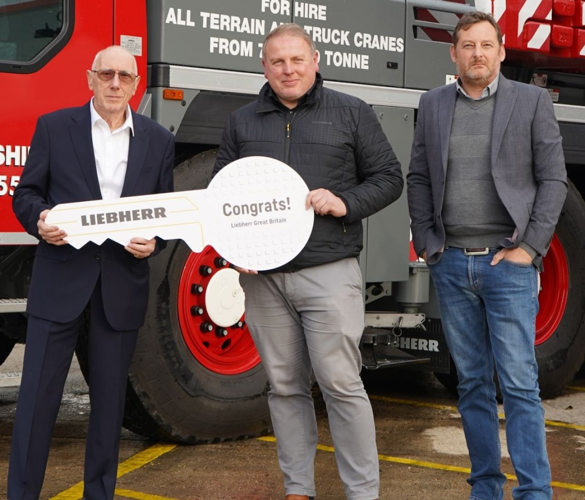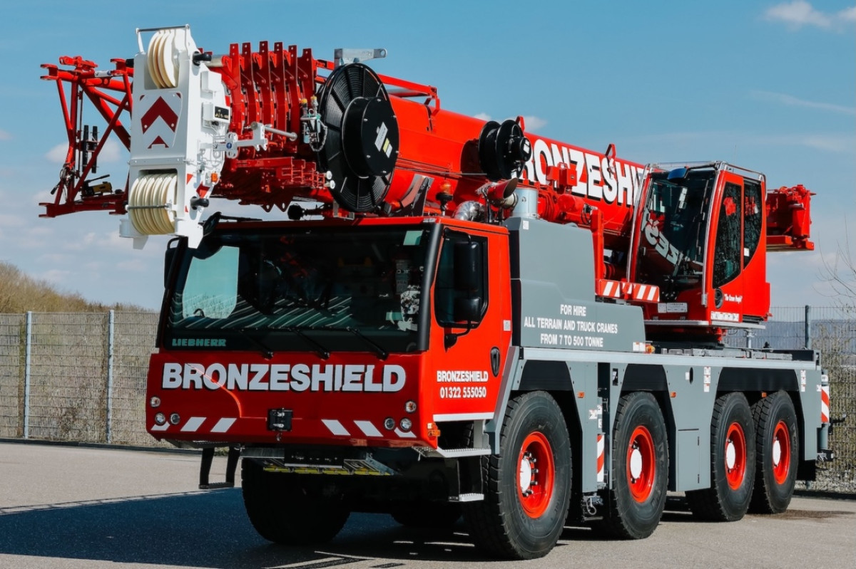 L-R) Bill Frost of Bronzeshield with Paul Goodall of Liebherr, and Tyrone Domain of Bronzeshield ----------------------------------------------------------------------------- Bronzeshield hat die Lieferung der sechsten Liebherr-All-Terrain-Krane in einem Sechs-Einheiten-Paket abgeschlossen, das 2024 seinen Anfang nahm. Das Paket umfasst drei LTM 1090-4.2 mit 90 Tonnen Tragfähigkeit, einen LTM 1150-5.3 mit 150 Tonnen und zwei LTM 1060-3.1 mit 60 Tonnen. Der dreiachsige LTM 1060-3.1 – das jüngste Exemplar – ist mit einem sechsfach verlegbaren 48-Meter-Haken ausgerüstet, der von einer bi-fold-Swingaway-Auszugslösung von 9,5 bis 16 Metern gekrönt wird und eine maximale Kranhöhe von über 67 Metern ermöglicht, zudem bietet er bis zu 40 Grad Versatz. Die Baulänge erlaubt es, alle 12,8 Tonnen Gegengewicht innerhalb der britischen STGO-Vorgaben zu transportieren, die Achslasten von bis zu 16,5 Tonnen gestatten. Der vierachsige LTM 1090-4.2 verfügt über einen Hauptausleger von 60 Metern plus eine 9,5–16 Meter bi-fold Swingaway-Erweiterung, was eine maximale Spitzenhöhe von knapp 80 Metern ergibt. Die größte Einheit im Paket, der fünfachige LTM 1150-5.3, ist mit einem 66 Meter langen, siebenlagigen Hauptausleger sowie der 10,8–19 Meter bi-fold Swingaway-Erweiterung ausgestattet, die hydraulisch um bis zu 40 Grad verleicht wird. Ein sieben Meter langer Einschub ermöglicht eine spitze Höhe von fast 95 Metern. Bronzeshield hat seinen Sitz in Crayford, Kent, im Süden Londons. Die Flotte umfasst All-Terrain-Krane bis 500 Tonnen, Spinnenkrane und Spierings-Mobilbaukrane. Darüber hinaus betreibt das Unternehmen Standorte in Bromsgrove bei Birmingham und Norwich in East Anglia.