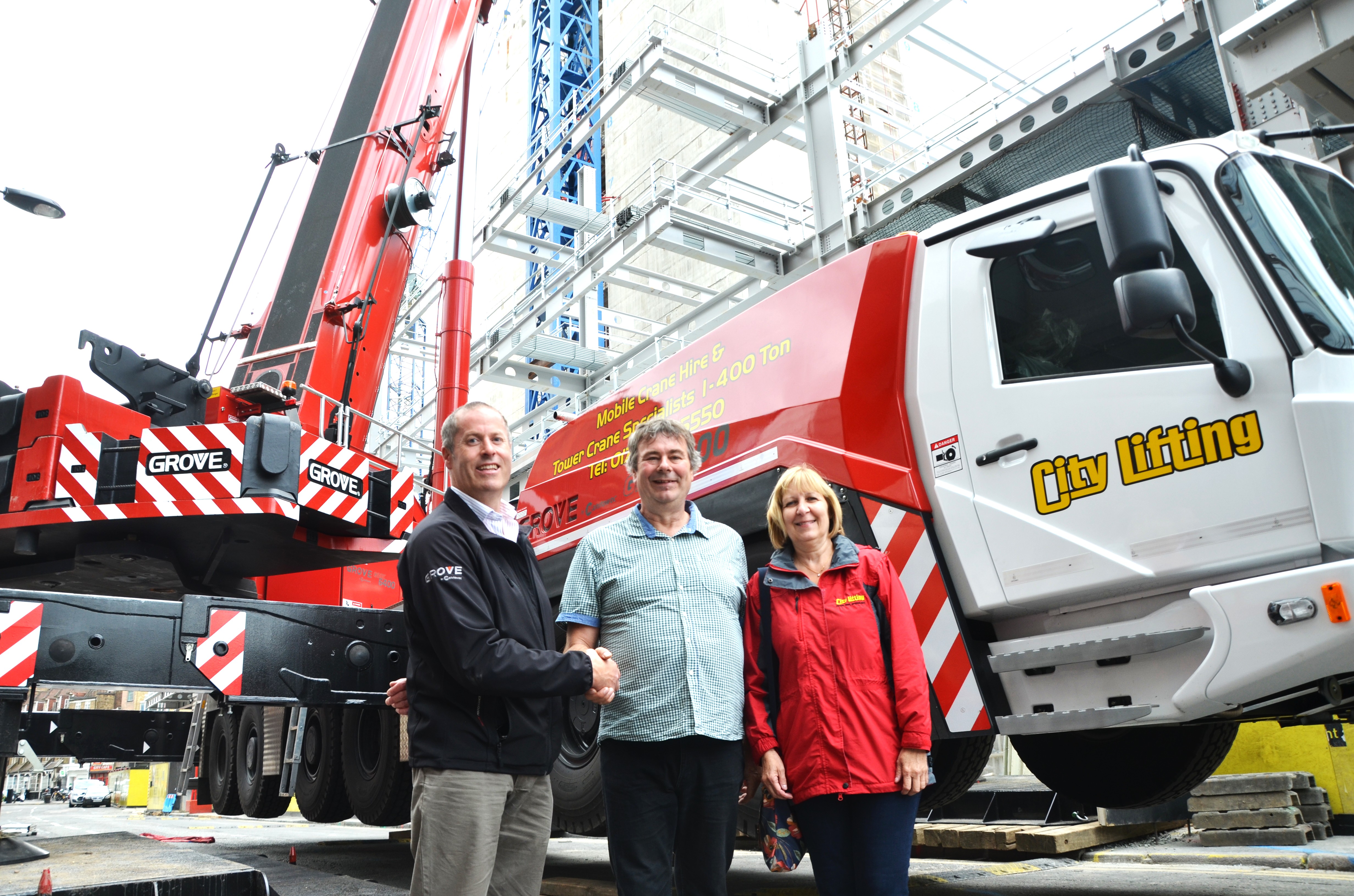 Jerry Welford, Vertriebsleiter von Manitowoc UK, mit Trevor und Clare Jepson von City Lifting; stolze Besitzer des ersten Grove GMK6400 in Großbritannien.----------------------------------------Das Londoner Kranverleihunternehmen City Lifting hat den ersten Grove GMK6400 Kran in Großbritannien erworben. Es ist der zweite Grove-Geländekran des Unternehmens und ergänzt den GMK6300L, der letztes Jahr in den Fuhrpark aufgenommen wurde. Der sechsachsige Kran wird dem Unternehmen helfen, die gestiegene Kundennachfrage nach Kranen mit höherer Tragfähigkeit zu decken. Der GMK6400 mit 400 t Tragfähigkeit ist derzeit der stärkste mobile Kran mit sechs Achsen. Der Schwerlastkran zeichnet sich durch eine Reihe von Konstruktionsmerkmalen aus, die es ihm ermöglichen, viele Aufgaben eines siebenachsigen Krans zu übernehmen. Dies bietet Vorteile beim Zugang zu beengten Baustellenbereichen. Neben Innovationen wie dem hydrostatischen Megadrive-Antrieb und dem Einzelmotor-Design mit Fuel Saver-Option verfügt der Kran über einen beeindruckenden 79 m langen Ausleger für eine in dieser Klasse führende Reichweite. Trotz seiner außergewöhnlichen Reichweite ist der Kran relativ kompakt und bietet dank der drei verfügbaren Abstützpositionen – mehr als jeder andere Kran dieser Klasse – eine hervorragende Flexibilität auf der Baustelle. Dies gewährleistet maximale Flexibilität, insbesondere bei beengten Platzverhältnissen, sei es auf der Baustelle oder in engen Straßen im Zentrum Londons. Das moderne Design des Grove-Modells, kombiniert mit seinem leistungsstarken 60-Meter-Ausleger, dem MegaWingLift-Tragfähigkeitserweiterungs-Anbaugerät und den kurzen Rüstzeiten, überzeugten City Lifting davon, dass der GMK6400 eine lohnende Ergänzung des Fuhrparks darstellt. „Wir freuen uns sehr, den ersten Grove GMK6400 in Großbritannien in unseren Reihen zu haben und ihn einzusetzen, um unseren Kunden effizientere und flexiblere Lösungen für ihre Schwerlastprojekte zu bieten“, sagte Trevor Jepson, CEO von City Lifting. „Wir haben ähnliche Maschinen anderer Hersteller geprüft, aber festgestellt, dass der GMK6400 der beste und zuverlässigste Kran ist, um die Anforderungen unserer Kunden zu erfüllen.“
