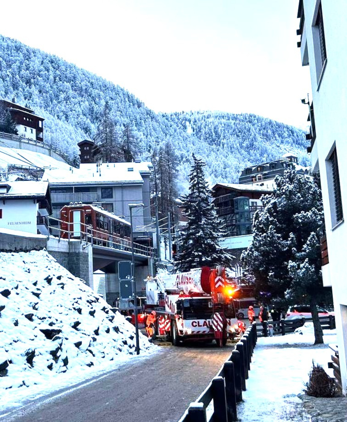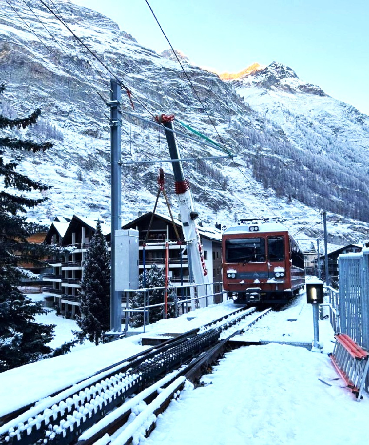 Die Gornergratbahn befördert Touristen und Wintersportbegeisterte von Zermatt in der Schweiz bis auf 3.100 Meter Höhe und bietet grandiose Ausblicke auf das Matterhorn, den Gornergletscher und 28 Gipfel über 4.000 m. Doch am Samstag blieb ein Zug wegen eines Motorschadens auf der Getwingbrücke in Zermatt stehen und ließ sich nicht mehr bewegen. In solchen Momenten braucht es kreative Ideen und verlässliche Partner. Zwei Mobilkrane der Clausen Kran AG wurden angefordert, um das Fahrzeug anzuheben und das Drehgestell auf der Schiene auszutauschen. Der gesamte Einsatz begann am Sonntagmorgen gegen 8 Uhr. Während der Reparaturarbeiten konnten Touristen und Wintersportler auf den Riffelberg-Express Zermatt Bergbahnen umsteigen und so weiterhin ins Gornergratgebiet gelangen.Die Kräne von Clausen Kran AG waren am Sonntagmorgen um 11:30 Uhr einsatzbereit und starteten die Hebearbeiten in super Präzision.