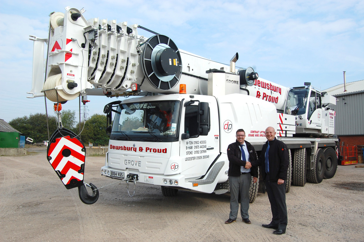 Tim Proud, Geschäftsführer von Dewsbury & Proud, und Andy Cahill (Manitowoc Cranes) bei der feierlichen Übergabe eines Grove GMK5130-2.--------------------------------------------Eine der führenden Kranverleihfirmen Großbritanniens, Dewsbury & Proud, erweiterte ihre Flotte aus 35 Grove-Kranen um einen neuen Grove GMK5130-2. Der Kran ist bereits voll im Einsatz und führt beim Bau eines Sportzentrums an der Universität Birmingham vielfältige Hübe durch. Der Grove GMK5130-2 mit 130 t Tragfähigkeit ist bereits der zweite Kran seiner Art, der in den letzten zwölf Monaten die Flotte von Dewsbury & Proud ergänzte, wie Geschäftsführer Tim Proud erläuterte. „Grove-Krane sind praxisbewährte Arbeitstiere; wir wissen, dass sie äußerst belastbar sind und immer gute Leistung erbringen“, so Proud. „Unsere Krane führen an jedem Tag der Woche an verschiedenen Einsatzorten in der Region Midlands Aufträge aus und als Kranverleihfirma brauchen wir Krane, die einfach zu transportieren und schnell zu rüsten sind. Dewsbury & Proud wird weiterhin Grove-Krane kaufen, da sie sich durch wettbewerbsfähige Preise, hervorragenden Kundendienst sowie Zuverlässigkeit auszeichnen.“In letzter Zeit wurden die Grove-Krane von Dewsbury & Proud auf Baustellen und industriellen Einsatzorten, in Kläranlagen und Versorgungsanlagen, an Flughäfen, großen Bürokomplexen und Fußballstadien genutzt. An seinem derzeitigen Einsatzort an der Universität Birmingham hebt der neue Grove GMK5130-2 vielfältige, allgemeine Baumaterialien, einschließlich Betonfertigteile, Stahlverschalungen, Betonkübel und Wandkäfige verschiedener Größen. Das neue Sportzentrum wird ein Schwimmbecken mit Olympiamaßen, eine Sporthalle mit 12 Badmintonfeldern, sechs Squashfeldern, eine Kletterwand und zwei hochmodernen Fitnesseinrichtungen aufweisen. Der überaus vielseitige Grove-AT-Kran GMK5130-2 verfügt über einen 60 m langen Hauptausleger, der mit dem hydraulischen Wippspitzen-Hilfsausleger auf 92 m verlängert werden kann. Der Kran lässt sich mit seinem gesamten Gegengewicht auf einem einzigen LKW transportieren, wodurch Transportkosten und Rüstzeit verringert werden. Die Firma Dewsbury & Proud unterstützt mit ihren Grove-Kranen-Projekten vielfältige Einsatzorte in der Region Midlands. Das Unternehmen verfügt über vier Betriebshöfe in Wolverhampton, Stoke-on-Trent, Coventry und Loughborough.