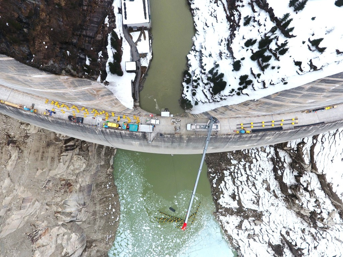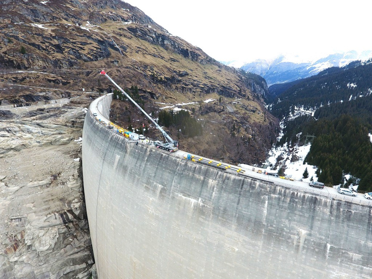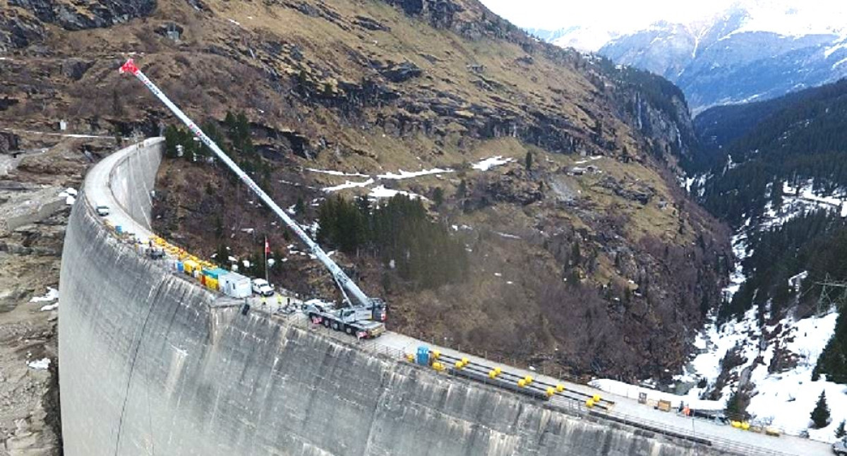 Um die Saugbaggerkomponenten, einen Ponton, Rohre und weiteres Material – teilweise bis zu 7,8 Tonnen schwer – 130 Meter tief in den Stausee absenken zu können, wurde der Kran mit einem 32,9 Meter langen Hauptausleger und 46 Tonnen Gegengewicht ausgestattet. „Aufgrund der konvexen Kontur des Staudamms mussten wir mit einem Radius von bis zu 27,5 Metern arbeiten. Das war für unseren Demag AC 160-5 aber überhaupt kein Problem“, berichtet Josef Waser, der mit der Leistung des Demag-Krans und dem hervorragenden Service des Demag-Teams, mit dem er eine langjährige und gute Geschäftsbeziehung pflegt, sehr zufrieden ist: „Es ist immer gut zu wissen, dass wir uns in jeder Situation auf guten und schnellen Service verlassen können“, betont er. Wie in den meisten Fällen verlief auch dieser Auftrag reibungslos, sodass der Kranführer alle Hübe an einem einzigen Tag alleine erledigen konnte.