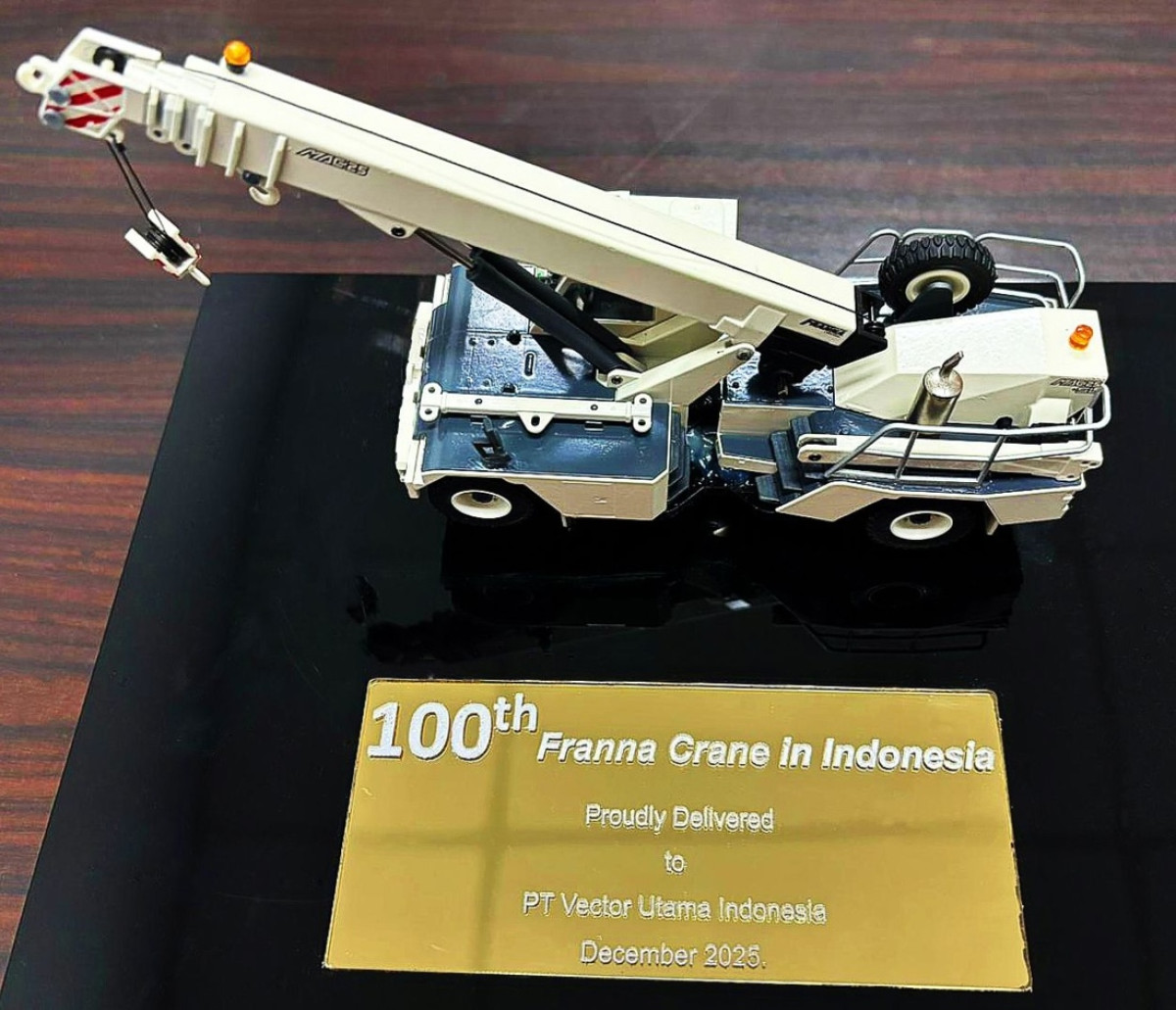 Der Kran ist der dritte in der Flotte des Unternehmens und wurde durch den lokalen Distributor PT Berlian Cranserco geliefert. Er besitzt einen 18 Meter langen Viersektionen-Ausleger und eine kurze Dreimeter-Jib, was eine maximale Spitzenhöhe von 21,5 Metern ermöglicht. Das Gesamtgewicht liegt knapp unter 24 Tonnen. Zu den wichtigsten Merkmalen zählt der Dynamic Load Moment Indicator mit Echtzeit-Lastüberwachung. Franna-Geschäftsführer Danny Black sagte: „Dieser Meilenstein unterstreicht die Stärke unserer Partnerschaft mit Cranserco und das Vertrauen, das Kunden wie Vector in Franna-Krane setzen. Wir verpflichten uns, Indonesiens wachsenden Infrastrukturbedarf mit sicheren, vielseitigen und zuverlässigen Lösungen zu unterstützen.“ A Mac 25 Maßstabmodell Matt Peeler von Vector Indonesia ergänzte: „Unser Geschäft umfasst sowohl Stahlbau in einer Werkstatt als auch Bauarbeiten vor Ort. Die Franna-Krane sind äußerst nützlich, um schwere Bauteile im Arbeitsbereich zu bewegen und dienen als Krane bei der Strukturmontage. Der Franna-25-Tonnen-Kran ist besonders hilfreich in Kombination mit unseren Mobilkränen, unterstützt beim Beladen und Entladen von Gegengewichten, beim Halten von Strukturelementen während der Vormontage und bei Tandemheben.“ PT Vector Indonesia ist Teil des kanadischen Unternehmens Vector Corrosion Technologies, das auf Korrosionsschutz für vorgefertigten Beton spezialisiert ist, und ist seit 2010 in Indonesien tätig.