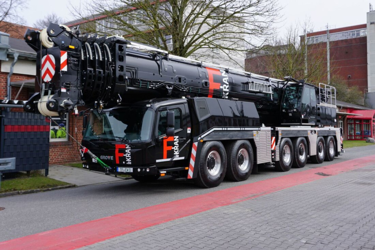 Die in Rangsdorf in Brandenburg ansässige Firma Fröhlich Bau Kran- und Baustellenlogistik hat sich den Bestseller aus dem Grove-Sortiment zugelegt: das Modell GMK6450-1 mit 450 Tonnen Traglast. Vor Kurzem wurde das Neugerät, optisch ansprechend, in markantem Schwarz und mit Alufelgen ausgestattet übergeben. Der eigentliche Trumpf dieses Krans liege in der Verbindung zwischen seiner außerordentlich hohen Leistungsfähigkeit und der durchdachten Rüsttechnik, so der deutsche Grove-Händler Kranagentur Werner. Der GMK6450-1 erreicht am bis zu 79 Meter langen wippbaren Hilfsausleger Rollenhöhen bis 133 Meter.---------------------------------Neben den hohen Traglasten freuen sich Firmenchef Rainer Fröhlich und sein Team über die enthaltenen Features hinsichtlich Komfort und Sicherheit für Kranfahrer und Anschläger. Das Fußstück des Gittermastauslegers wird hydraulisch mit dem Hauptausleger verbolzt – vom Boden aus, per Fernbedienung, ohne dass der Kranfahrer auf die Maschine klettern muss. Geländer auf Hauptausleger, Kopfstück, Hilfshubwerk und ein Rüstkorb zum sicheren Rüsten des Gegengewichtes erhöhen die Arbeitssicherheit beim Kranaufbau und erhöhen die gefühlte Sicherheit beim Bedienpersonal.-----------------------------------Neu ist der akkubetriebene Pendelscheinwerfer, der entweder am Kopf des Auslegers oder an die Gitterspitze angebaut werden kann. Er bietet bis zu 8 Stunden Akkulaufzeit und lässt sich bequem per Fernbedienung aus der Oberwagenkabine ein- und ausschalten. Eingesetzt werden soll der neue Mobilkran in erster Linie bei der Montage von Turmdrehkranen. Doch bei dem einen Gerät aus Wilhelmshaven soll es nicht bleiben: Demnächst soll noch ein weiterer GMK an das Unternehmen gehen. Um welches Modell es sich handelt, wurde nicht mitgeteilt. Nur soviel: „Wer gleich mit zwei der erfolgreichsten GMK-Mobilkrane aus dem Grove-Sortiment einsteigt, der meint es ernst.“--------------------------
