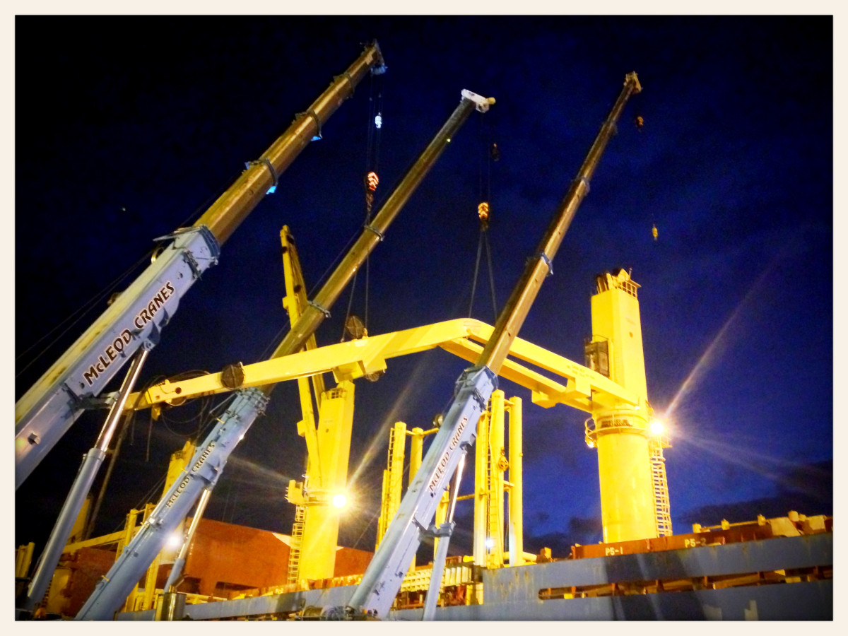 Als der Ausleger eines Schiffskrans im Hafen von Tauranga, Neuseeland, zusammenbrach, setzte das örtliche Kranverleihunternehmen McLeod Cranes drei Grove-All-Terrain-Krane ein, um die anspruchsvolle Aufgabe zu bewältigen. Die eingesetzten Krane waren ein GMK5170 mit 170 t Tragfähigkeit, ein GMK5130 mit 130 t Tragfähigkeit und ein GMK4075 mit 75 t Tragfähigkeit. Obwohl alle drei Krane das 16 t schwere, verbogene und verdrehte Auslegersegment anheben konnten, erforderte das Manövrieren der unhandlichen Last sorgfältige Teamarbeit und kontrollierte Bewegungen. Das Team kannte zwar das Gewicht des Auslegers, doch der Schwerpunkt ließ sich nicht bestimmen, und ein Gewirr aus Kabeln erschwerte die Aufgabe zusätzlich – das Auslegersegment anzuheben, ohne weitere Schäden zu verursachen. Scott McLeod, Geschäftsführer von McLeod Cranes, erklärt: „Wir haben drei Kräne eingesetzt, um den Ausleger vorsichtig bergen zu können, ohne das Schiff weiter zu beschädigen“, sagt er. „Wir haben Hebeösen am Ausleger verwendet, um ihn behutsam zu manövrieren. Es war eine langsame und vorsichtige Arbeit, aber wir haben so effizient wie möglich gearbeitet.“ Ein Team von Page Macrae Engineering arbeitete bei der Bergung mit McLeod Cranes zusammen. McLeod Cranes wurde 1996 gegründet und ist ein Spezialist für Hebe- und Transportdienstleistungen mit Niederlassungen in Mt Maunganui und Taupo auf der Nordinsel