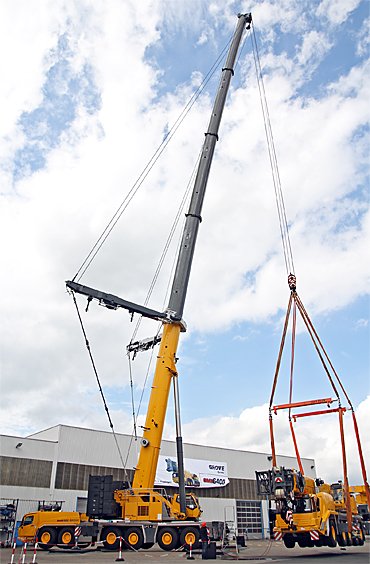 Der neue GMK6400, ausgestattet mit dem kapazitätssteigernden Mega Wing Lift-Aufsatz, hebt während eines Kundentages in Wilhelmshaven in Deutschland einen seiner Schwesterkrane aus der Grove-Geländekranreihe, den GMK5130-2, an.Manitowoc begrüßte knapp 300 Gäste zu einer Kundenveranstaltung in seinem Werk in Wilhelmshaven, um die neuesten Qualitätsverbesserungen des Werks vorzustellen. Die Besucher hatten zudem die erste Gelegenheit, den Grove GMK6400 in Aktion zu erleben. Der Kran ist der leistungsstärkste sechsachsige Geländekran auf dem Markt und überzeugte die Besucher mit einer Reihe beeindruckender Hebevorgänge. Das Quality Days Forum fand am 10. und 11. Mai 2012 statt; Kranbesitzer aus Europa, Amerika, Kanada und Australien nahmen daran teil. Thomas Steuer, Vizepräsident für operative Angelegenheiten im Werk Wilhelmshaven, sagte, die Veranstaltung unterstreiche das Engagement von Manitowoc für den Bau qualitativ hochwertiger Krane. „Wir möchten gegenüber unseren Kunden offen und transparent sein und nicht nur über unsere Verbesserungen sprechen, sondern ihnen zeigen, worin diese Verbesserungen bestehen und warum sie wichtig sind“, sagte er. „Qualitätsverbesserung ist ein kontinuierlicher Prozess und unser Hauptaugenmerk. Wir vergessen dabei aber nie, wie wichtig es ist, enge Beziehungen zu unseren Kunden zu pflegen – sowohl über unseren Vertrieb als auch über das Servicenetzwerk von Manitowoc Crane Care. Wir werten das Feedback zu jedem von uns ausgelieferten Kran genau aus, und diese Informationen helfen uns, unsere Arbeit stetig zu verbessern.“ Manitowoc hat sich über mehrere Jahre hinweg auf die Verbesserung der Infrastruktur in Wilhelmshaven konzentriert, um alle Aspekte der Kranproduktion zu optimieren. Die Qualitätsverbesserungen erstrecken sich von der Konstruktion und dem Einkauf über technische Dienstleistungen und Schulungen bis hin zur Fertigung und Auslieferung. Eine der wichtigsten Veränderungen war unsere schrittweise Umstellung auf schlanke Produktionsverfahren. Dadurch wird der Lieferkettenprozess optimiert, die Anzahl der Komponenten in der Produktionslinie reduziert und die Mitarbeiter effizienter eingesetzt. Darüber hinaus wurde die Fertigungshalle neu organisiert, die Produktionsbestände werden minimiert und Lieferungen erfolgen häufiger, was zu einer besseren Steuerung der Kranlieferungen führt. Nach einer ausführlichen Werksführung versammelten sich die Gäste in der Nähe des Testgeländes, um den GMK6400 in Aktion zu erleben. Dieser Neuzugang in der Produktionslinie ist ein 400-Tonnen-Geländekran auf einem sechsachsigen Fahrgestell und die stärkste Maschine seiner Klasse. Er verfügt über einen 60 Meter langen Ausleger und das selbstmontierende MegaWingLift-System zur Kapazitätserweiterung. Auf dem Testgelände demonstrierte ein GMK6400 seine Stärke, indem er einen 60 Tonnen schweren, fünfachsigen Grove GMK-Geländekran anhob. Der GMK6400 führte den Hub mit voll ausgefahrenem 60-Meter-Hauptausleger und montiertem MegaWingLift-Aufsatz durch. Ein zweiter GMK6400, ebenfalls mit MegaWingLift ausgestattet, vollführte anschließend eine noch beeindruckendere Hebeleistung. Der Kran hob 8 Tonnen mit einer Konfiguration aus 55 Metern Hauptausleger und 79 Metern Wippausleger – eine Leistung, die derzeit kein anderer sechs- oder siebenachsiger Kran erbringen kann. Andreas Cremer, Produktmanager für All-Terrain-Krane bei Manitowoc, sagte, der GMK6400 sei ein absolutes Highlight der Veranstaltung gewesen. „Diese marktführende Maschine ist schon auf dem Papier beeindruckend, aber noch viel beeindruckender, wenn man sie in Aktion sieht“, sagte er. „Unsere Kunden waren von ihren Fähigkeiten sehr beeindruckt und genossen die Gelegenheit, einen unserer Vorzeigekrane zu besteigen.“ Der GMK6400 geht in Serienproduktion; die ersten Exemplare werden noch in diesem Jahr an Kunden in Deutschland, Italien, Frankreich und den USA ausgeliefert. Zu den weiteren ausgestellten Kranen gehörten 15 GMK-Geländekrane, die die breite Palette an Tragfähigkeiten und Einsatzmöglichkeiten von Grove demonstrierten. Der einzigartige GTK1100 wurde ebenfalls auf der Veranstaltung vorgeführt. Dank seiner beeindruckenden Leistungsfähigkeit kann er Lasten von 70 Tonnen in Höhen von über 120 Metern heben und kommt dabei mit nur vier oder fünf Anhängern aus. Das Werk Wilhelmshaven fertigt zehn Modelle der Grove-Geländekrane, vom vierachsigen GMK4080-1 bis zum siebenachsigen GMK7450. Der GTK1100 wird in einer separaten Produktionsstätte im nahegelegenen Werk gefertigt. Wilhelmshaven steuert außerdem die Fertigung in Niella Tanaro, wo die zwei- und dreiachsigen Grove-GMK-Krane produziert werden. Das Quality Days Forum hob die jüngsten Erfolge von Manitowoc im Bereich der Qualitätssicherung hervor. Das Werk hatte zuletzt 2010 eine derartige Veranstaltung für Kunden ausgerichtet.