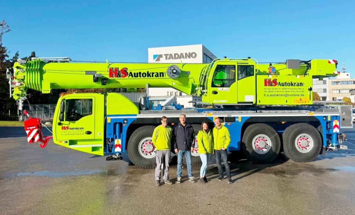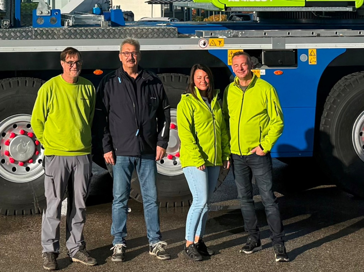 v.l-r. Steven Bewick von H&S Autokran mit Helge Prüfer von Tadano, mit Svenja Heider und Matthias Schug von H&S