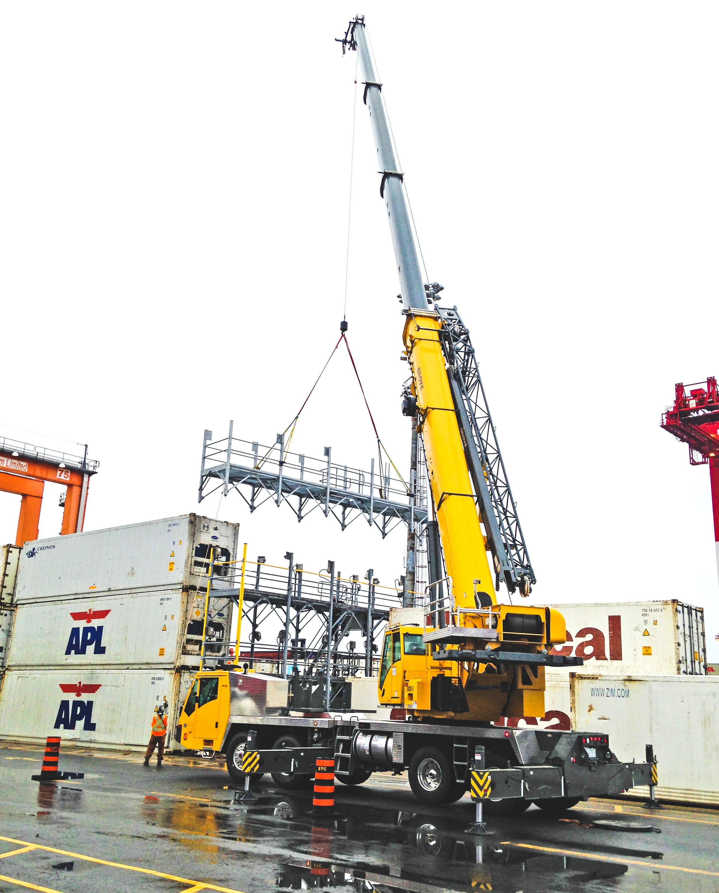 Das in Burnside, Nova Scotia, ansässige Unternehmen ist das erste in Kanada, das den 115 USt Grove TMS9000-2 LKW-Kran in Empfang genommen hat, der branchenführende Traglasttabellen auf einem Trägerfahrzeug aufweist, das leichter ist als vergleichbare LKW-Kranmodelle. Der beeindruckende 169 Fuß lange Hauptausleger des Grove TMS9000-2 hat der Forschungs- und Entwicklungsabteilung geholfen, Stunden auf der Baustelle zu sparen, da die Installation eines Schwenkauslegers entfiel. Als Manitowoc im Februar 2017 den Grove TMS9000-2 vorstellte, enthüllte das Unternehmen auch das Leitmotiv hinter der Krankonstruktion: leichter, länger, stärker. Genau diese Eigenschaften führten dazu, dass R&D Crane Rental (R&D) als erstes Unternehmen in Kanada den neuen LKW-Kran in Empfang nahm. Für das in Burnside, Nova Scotia, ansässige Vermietungsunternehmen stellte der TMS9000-2 eine Chance dar, sein Geschäft auszubauen und die Konkurrenz zu übertreffen. „Wir sind ein relativ junges Unternehmen und wollten unseren Fuhrpark um einen Kran erweitern, der unseren Ruf in Kanada stärkt“, sagte Alex Jenkins, Betriebsleiter der Forschungs- und Entwicklungsabteilung. „Wir sind überzeugt, dass der TMS9000-2 genau das erreicht hat. Das Hauptargument für uns war der längere Hauptausleger. Vergleichbare Krane haben nur 43 Meter Hauptausleger, der TMS9000-2 hingegen 51,5 Meter. Diese zusätzliche Reichweite spart uns wertvolle Arbeitsstunden, da wir keinen Schwenkausleger mehr am Kran montieren und demontieren müssen.“ Die größere Reichweite des TMS9000-2 erweist sich bereits auf der Baustelle als äußerst nützlich. Die Forschungs- und Entwicklungsabteilung setzt den Kran beim Bau eines neuen Marriott-Hotels in Halifax, Nova Scotia, ein. Dort hebt der Kran Schalungselemente mit Radien von 42 bis 46 Metern. Der Einsatz des Krans auf diesem Projekt wird voraussichtlich bis Januar 2018 andauern. Jenkins hob außerdem hervor, dass das Gewicht des Krans und seine Tragfähigkeit von 115 USt der Forschungs- und Entwicklungsabteilung einen Vorteil gegenüber der Konkurrenz verschafften. „Der TMS9000-2 hat ein vergleichbares Gesamtgewicht wie ein Kran mit geringerer Tragfähigkeit, bietet aber zusätzlich eine größere Auslegerlänge. Dadurch ist es einfacher, die erforderlichen Straßengenehmigungen in unserer Region zu erhalten“, erklärte Jenkins. „Der Kran ist seit seiner Anschaffung fast täglich im Einsatz. Er bietet uns die nötige Reichweite, um uns an unterschiedlichste Baustellen anzupassen.“ Das Unternehmen erwarb den TMS9000-2 von Shawmut Equipment, einem in Manchester, Connecticut, ansässigen Händler von Manitowoc-, Grove-, Potain- und National Crane-Produkten, der seit 1957 Neuengland und die Atlantikprovinzen Kanadas bedient. R&D Crane ist ein Geschäftsbereich der Cherubini-Unternehmensgruppe und bietet Krandienstleistungen für zahlreiche Branchen an, darunter Bauwesen, Gewerbe, Schifffahrt, Windenergie und Wohnungsbau. Das Team von R&D, bestehend aus zertifizierten Kranführern, Ingenieuren und Managern, hat Manitowoc-Krane bereits bei mehreren Projekten eingesetzt, unter anderem beim Bau der McDonald-Brücke bei Halifax, wo das Unternehmen einen Manitowoc 16000 verwendete.