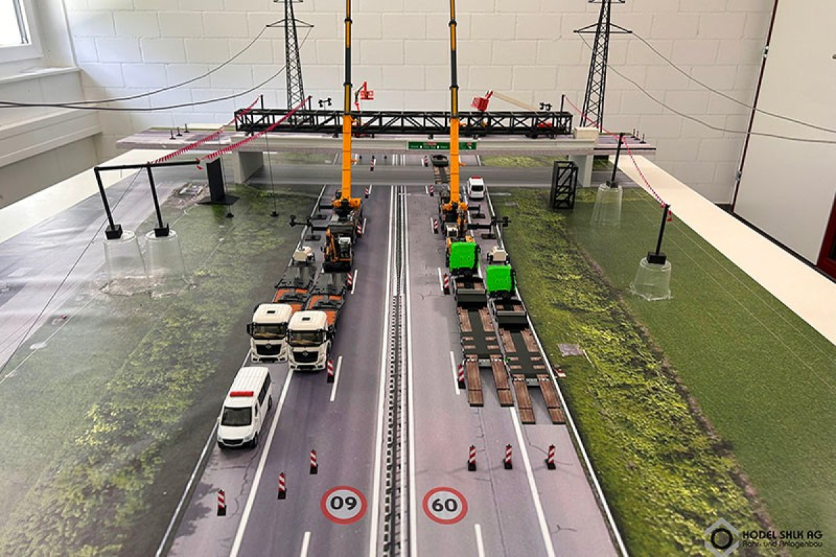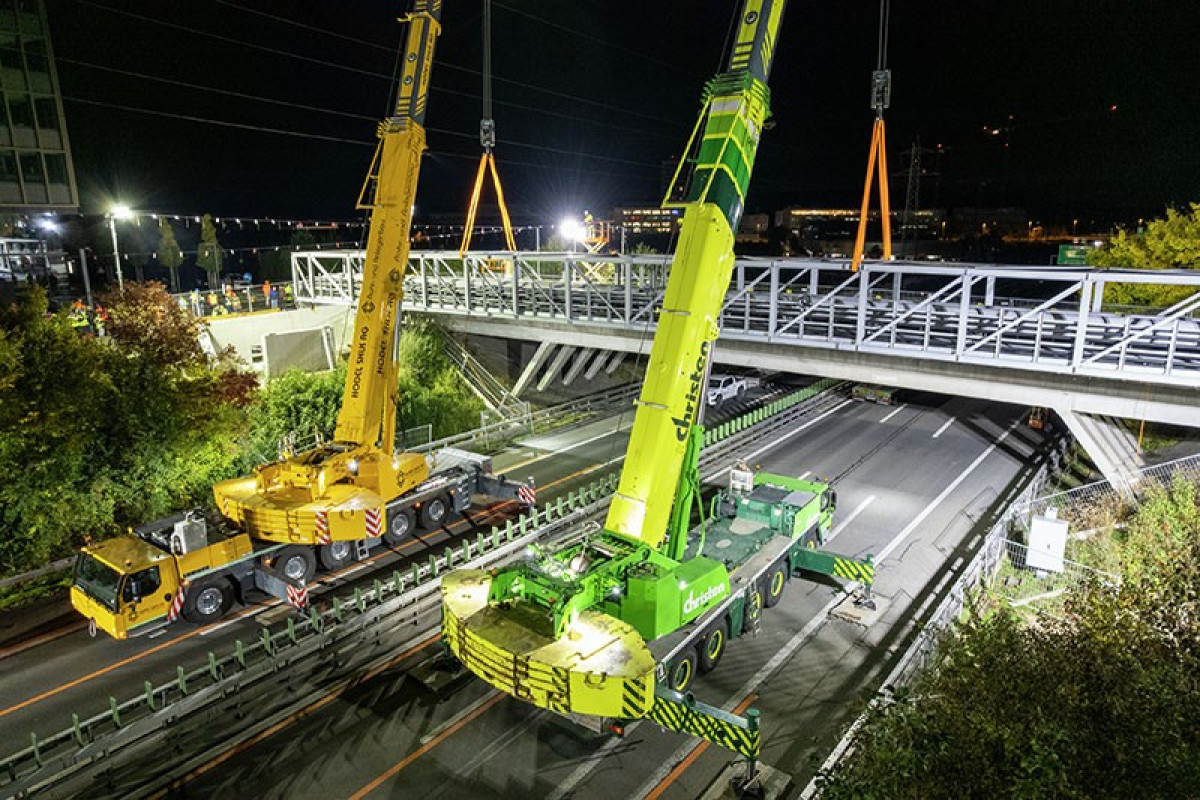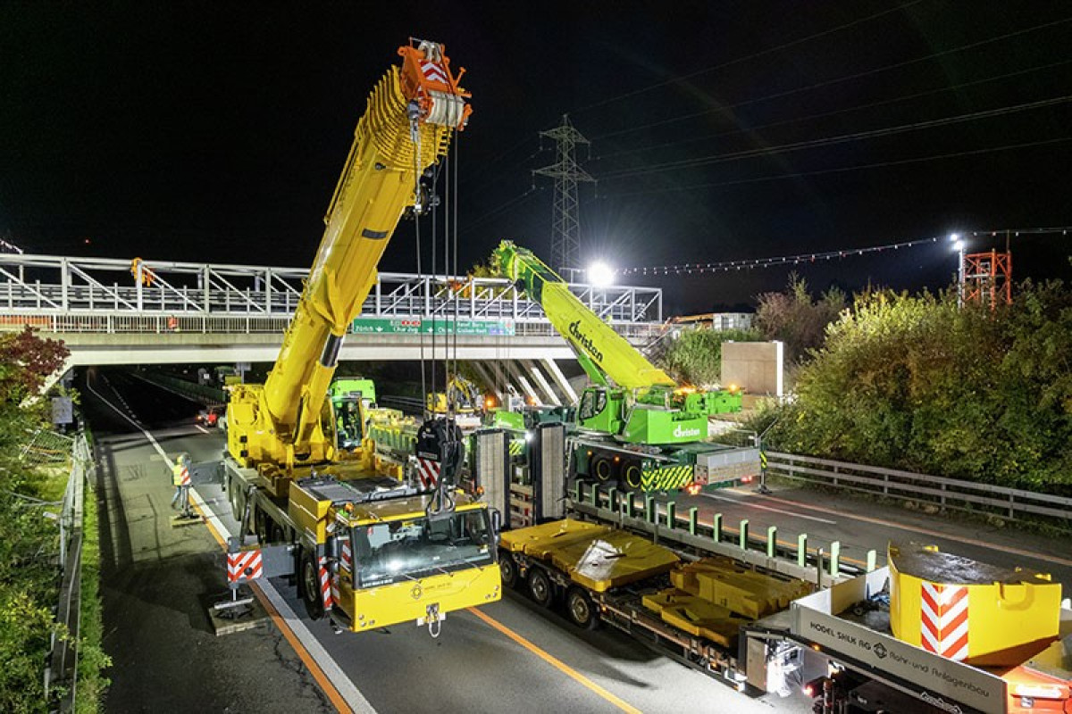 In einer spektakulären Nachtaktion wurde im schweizerischen Rotkreuz (Kanton Zug) eine rund 60 Tonnen schwere Rohrbrücke über die Autobahn A41 installiert. Der Einsatz erforderte einen enormen logistischen Aufwand und war Teil des Aufbaus eines neuen Fernwärmenetzes. Ein Jahr lang plante Jörg Hodel, Inhaber der Hodel SHLK AG, das komplexe Vorhaben bis ins Detail. Für die finale Montage kamen zwei Liebherr-Mobilkrane vom Typ LTM 1230-5.1 zum Einsatz, die die 47 Meter lange Rohrbrücke über beiden Fahrbahnen der Autobahn platzierten. Die Kranarbeiten wurden aufgrund der erforderlichen Teil- und Vollsperrungen der hochfrequentierten Fernstraße bei Nacht durchgeführt.------------------------------------------Der gelungene Tandemhub zweier Liebherr-Mobilkrane LTM 1230-5.1 war der erfolgreiche Abschluss einer akribisch geplanten Meisterleistung Angesichts des engen Zeitfensters bei gesperrter Autobahn wurde der Hub auf dem Firmengelände der Hodel SHLK AG vorab unter realistischen Bedingungen simuliert: Vormontage der dreiteiligen Leitungsbrücke, anschließendes Anheben und Absetzen auf simulierte Auflager mit originalen Abstandsparametern. Für den Transport wurde die Rohrbrücke danach wieder in ihre Einzelteile zerlegt.---------------------------------- Insgesamt vier Nachteinsätze waren für den Einbau der gewaltigen Medienbrücke an der Autobahn erforderlich. Bevor der finale Tandemhub der Gesamtlast erfolgen konnte, wurde die Rohrbrücke auf einer angrenzenden Bestandsbrücke in zwei Nachtschichten erneut zusammengebaut und montagefertig vorbereitet. Dabei kam neben dem LTM 1230-5.1 ein weiterer Mobilkran von Hodel, ein LTM 1100-5.2, zum Einsatz. Während dieser seitlich der Brücke die präzise Positionierung der Bauteile unterstützte, übernahm der auf der Autobahn platzierte LTM 1230-5.1 die Hauptlast.--------------------------------------- Zusätzliche Herausforderungen für die Montageteams ergaben sich durch zwei Hochspannungsleitungen, die beidseitig der Fernstraße in unmittelbarer Nähe zum Baufeld verlaufen. Da die wichtige Stromtrasse zur Versorgung der Schweizer Bahn sowie als wichtige Verbindung ins Tessin und nach Norditalien nur teilweise abgeschaltet werden konnte, wurden unter den Leitungen sogenannte Wimpelseile angebracht. Sie markierten die dort maximal zulässige Arbeitshöhe für Krane und Last und gewährleisteten so einen sicheren Ablauf der Hebearbeiten.------------------------------------ Diorama als Planungswerkzeug Diese Hochspannungsleitungen flossen sogar in ein vorab mit großer Akribie erstelltes Diorama ein. Das detaillierte Baustellenmodell im Maßstab 1:50 bildete sämtlich relevanten Objekte realitätsnah ab. Neben den Stromtrassen waren unter anderem auch die eingesetzten Krane und Baumaschinen, die Rohrbrücke sowie die Fahrspuren der Autobahn präzise nachgebildet. Das anschauliche Modell erwies sich als zentrales Planungsinstrument für die Abstimmungen zwischen den zahlreichen am Projekt beteiligten Unternehmen und Behörden.--------------------------------- Die intensive Vorbereitung und die präzise Planung von Jörg Hodel zahlten sich in jeder Hinsicht aus: Beim entscheidenden Nachteinsatz klappte alles reibungslos, und die strengen Zeitvorgaben aufgrund der Vollsperrung wurden exakt eingehalten. Zu Beginn der Sperrung hatten die Teams aller beteiligen Partner sowie die Mobilkrane ihre Positionen an den Auffahrten zur Baustelle bezogen. Jeder Beteiligte kannte seine Aufgabe, die Abläufe waren klar definiert und abgestimmt. Nach einer guten Stunde stand auf jeder Fahrbahn ein zugbereiter LTM 1230-5.1 vollständig ballastiert und sicher abgestützt. Das Anschlagen der Last an den zuvor definierten Punkten, das Anheben der Rohrbrücke sowie das millimetergenaue Absetzen auf den Auflagern verliefen ruhig und präzise wie ein Uhrwerk. Noch bevor der morgendliche Berufsverkehr einsetzte, hatten die Krane die Baustelle bereits verlassen.---------------------------------- Die Hodel SHLK AG mit Sitz im nördlich von Luzern gelegenen Hochdorf ist spezialisiert auf Rohr- und Anlagenbau. Zudem bietet das inhabergeführte Unternehmen den Bau von Heiz- und Energiezentralen sowie Dienstleistungen in den Bereichen Stahlbau, Transport, Kranarbeiten, Tiefbau und Vermessung an.