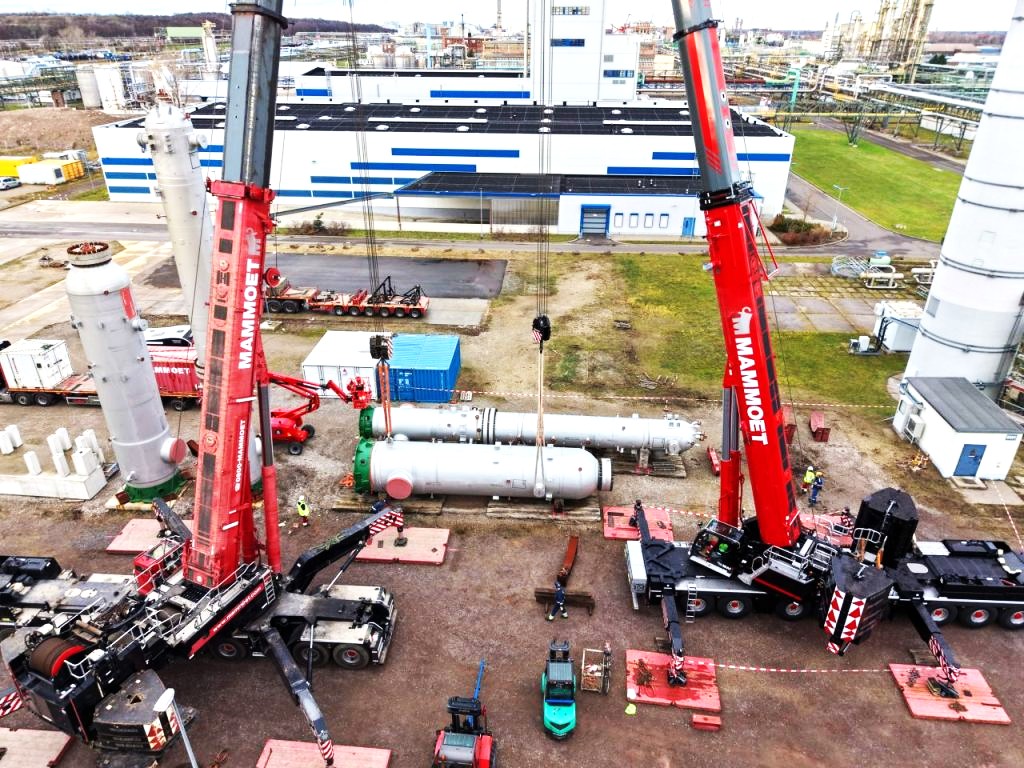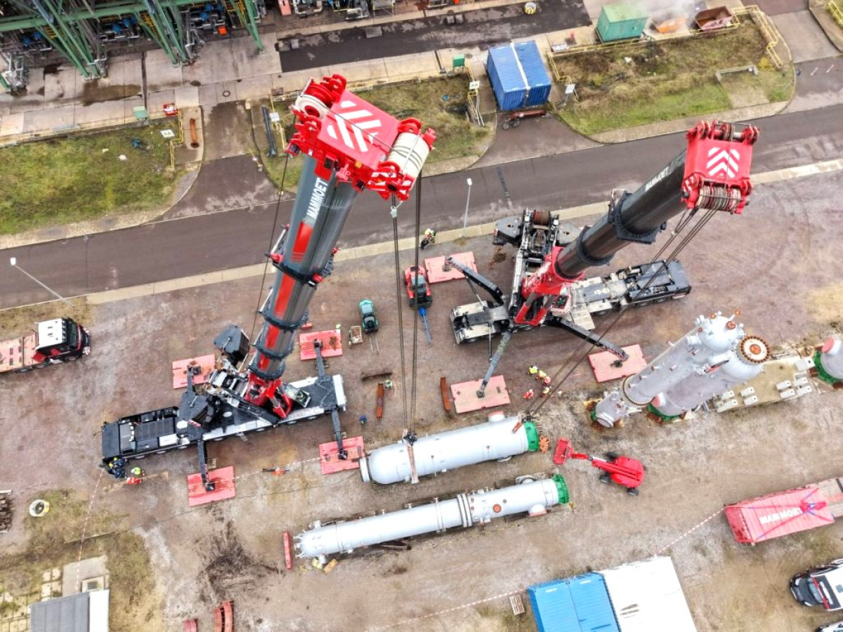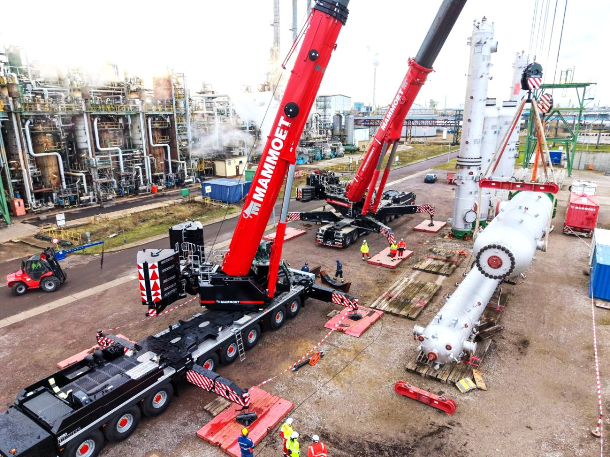 Das Kranteam von Mammoet bewegte im Auftrag von Bilfinger zwei Reaktoren präzise und effizient auf den Vormontagebereich der TotalEnergies Raffinerie Mitteldeutschland GmbH. Für die Tandem-Hebearbeiten kamen der Liebherr LTM 1750-9.1 sowie der neue Liebherr LTM 1450-8.1 zum Einsatz. Dank der hervorragenden Zusammenarbeit aller Beteiligten liefen die Schwerlasttransporte sicher und planmäßig ab.