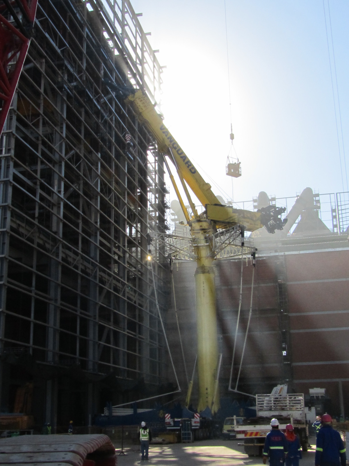 Bei einem der größten Kraftwerksprojekte in der südlichen Hemisphäre wird die volle von Manitowoc aufgebotene Hubleistung genutzt, um die Bau- und Zielvorgaben einzuhalten. Ein Team aus sechs Manitowoc-Raupenkranen, drei Potain-Turmdrehkranen und einem Grove-Mobilteleskopkran GTK1100 arbeitet derzeit am Medupi-Kraftwerk in Limpopo, der nördlichsten Provinz Südafrikas. Im fertig gestellten Kohlekraftwerk werden sechs Kessel zum Einsatz kommen, von denen jeder eine 800-MW-Turbine antreibt. Mit einer kombinierten Ausgangsleistung von 4800 MW wird das Medupi-Kraftwerk das größte trockengekühlte Kohlekraftwerk der Welt sein. Im Jahr 2008 nahm der erste Kran die Vorbereitungsarbeiten am Standort auf; Die letzten Krane trafen erst dieses Jahr ein. Es wird erwartet, dass die meisten bis zur Projektfertigstellung, die für 2015 geplant ist, am Einsatzort bleiben. Die sechs Raupenkrane wurden von der großen internationalen Verleihfirma Mammoet bereitgestellt, der GTK1100 von Vanguard und die Turmdrehkrane von Kentz und SA French. Das Projekt wird vom Hauptauftragnehmer Hitachi geleitet. Nach Aussage von Pieter van der Weele, Manager bei Mammoet South Africa, ist das Unternehmen stolz auf seine Mitwirkung an dem Projekt. „Als sich der Hauptauftragnehmer mit diesem Projekt an uns wandte, war Manitowoc der einzige Hersteller, der in der Lage war, rechtzeitig zum Projektstart so viele verschiedene Raupenkrane zu liefern“, erinnerte er sich. „Dank der Unterstützung durch Manitowoc Crane Care für dieses Projekt in Südafrika können wir schnell reagieren, wenn Wartungs- oder Reparaturarbeiten erforderlich werden, was für ein Projekt dieser Größe und Bedeutung absolut unabdingbar ist.“ Die Raupenkrane – ein Manitowoc 21000 mit einer Tragfähigkeit von 756 t und fünf Manitowoc 16000 mit einer Tragfähigkeit von 400 t – werden vornehmlich zum Heben von Stahlträgern und Stahlbaugruppen eingesetzt. Die zwei kleineren Potain-Turmkrane, ein MDT 98 mit einer Tragfähigkeit von 6 t und ein MDT 178 mit einer Tragfähigkeit von 8 t, heben ebenfalls tragende Stahlbauteile für die Schlauchfilter an, während der größere Spezialanwendungskran MD 1100 die Bauteile des luftgekühlten Kondensators sowie die darauf befindlichen Lüfter und Lüfterringe errichtet. Nach Angaben von Quentin van Breda, dem CEO von SA French, basiert die Auswahl der Turmkrane für das Projekt auf den beiden Faktoren Platzbedarf und Tragfähigkeit. „Kentz nutzte den MD 1100, weil dieser die Tragfähigkeit und Reichweite für schwerere Hublasten besitzt; diesen Kran mussten wir auch einfach haben“, sagte er. „Und weil der Platz für das Arbeiten mit den anderen Kranen beschränkt war, brauchten wir für die Arbeit mit den Schlauchfiltern auch den MDT. Wegen ihrer Topless-Konstruktion lassen sich die MDT-Krane in kürzerer Entfernung voneinander einsetzen; außerdem ist der Aufbau dank ihrer Modulbauweise einfacher. Das war hilfreich, weil der auf der Baustelle zur Verfügung stehende Platz wie auch der Zugang beschränkt waren.“ In der Zwischenzeit ist der Grove GTK1100 mit seiner 95-t-Tragfähigkeit rund um die Uhr mit dem Platzieren der Komponenten für zwei der Kessel im Einsatz. Craig Pace, Geschäftsführer bei Vanguard, verwies darauf, dass die kleine Stellfläche des GTK1100 eine strategisch günstige Positionierung rund um den Kessel ermöglicht. „Wir wussten, dass die Positionierung bei der großen Zahl der an dem Projekt beteiligten Krane besonders wichtig sein würde“, so Pace. „Der GTK1100 war der perfekte Kran für den Kessel, weil er mehr als genug Tragfähigkeit und mehr als genug Reichweite aufweist. Das beste Argument für diesen Kran war aber seine kleine Stellfläche.“ Vanguards Grove GTK1100, der einzige Kran seiner Art in der südlichen Hemisphäre, platziert derzeit bis zu 15 t schwere Komponenten in einer Höhe von ca. 100 m auf den Kesseln; Seine Stellfläche beträgt dabei lediglich 18 mx 18 m. Auch die Potain-MDT-Krane, die auf einem gerade einmal 4,6 mx 4,6 m großen Sockel aufgestellt sind, beanspruchen nur wenig Platz auf der großen Baustelle. Das Medupi-Kraftwerk wird nach seiner Fertigstellung das viertgrößte Kraftwerk der Welt sein. Es wird von Gesamtkosten in einer Höhe von ca. 120 Mrd. südafrikanischer Rand (€ 12 Mrd.) ausgegangen.