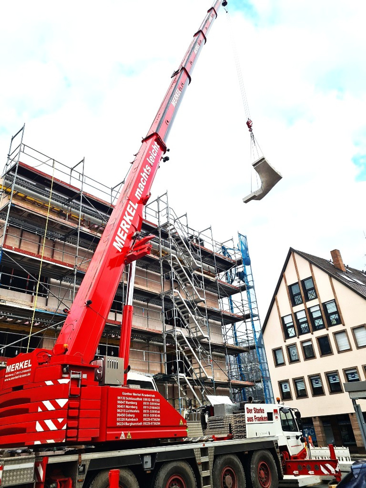 Wenn es eng wird auf der Baustelle, aber keine Kompromisse hinsichtlich der Leistung eingegangen werden sollen, fällt die Wahl bei der Merkel Autokrane GmbH häufig auf einen Tadano 4-Achser. So auch geschehen beim Bau eines Apartment-Hauses in Nürnberg. In Nürnberg ist es nicht anders als in anderen deutschen Großstädten: Wohnungen sind Mangelware. Dementsprechend häufig kann man den Bau von Mehrfamilienhäusern beobachten, um diesem Missstand entgegenzuwirken. Die durchführenden Bauunternehmen stehen bei diesen Projekten vor zwei besonderen Herausforderungen. Einerseits sind die städtischen Straßen meist sehr beengt und andererseits müssen Hubarbeiten schnell durchgeführt werden, um den Verkehr so wenig wie möglich zu beeinträchtigen. Wohl dem Krandienstleister, der einen kompakten und zuverlässigen Kran in seinem Fuhrpark weiß, der ihn bei der Lösung dieser Aufgaben optimal unterstützt. Die Merkel Autokrane GmbH hat für einen solchen Einsatz zuletzt auf einen Tadano ATF 70G-4 gesetzt – mit Erfolg. Kranhub einfach gemacht Merkel Autokrane hat seinen Hauptsitz im fränkischen Schlüsselfeld. Weitere Niederlassungen befinden sich in Bamberg, Burgkunstadt und Nürnberg. Inhaber und Geschäftsführer Günther Merkel arbeitet mit seinem 28 Mitarbeiter starken Team nach dem Motto „Merkel macht‘s einfach – Merkel macht’s leicht“. Dieser Slogan passt auch zum Tadano 4-Achser, der in Nürnberg zum Einsatz kam, weiß Günther Merkel: „Unser ATF 70G-4 in der 44-Meter-Variante überzeugt durch seine Bedienerfreundlichkeit und Zuverlässigkeit. In Kombination mit den kompakten Abmessungen macht es uns der 70er einfach, auch Jobs unter beengten Verhältnissen mühelos zum Erfolg zu führen.“ Effiziente Anfahrt Der Tadano ATF 70G-4 ist lediglich 12,45 Meter lang und mit 16.00 Reifen 2,66 Meter breit. Kombiniert mit den sauberen Achslasten des 4-Achsers macht diese Kompaktheit die Anfahrt zum Einsatzort besonders effizient und kostengünstig. Enge Zufahrtsstraßen stellen kein Hindernis dar. Beim Einsatz in Nürnberg konnte Merkel Autokrane das gesamte notwendige Gegengewicht in einem Zug – also Kran plus Anhänger – innerhalb einer Achslast von 12 Tonnen mitführen. Ein Zusatzfahrzeug war nicht notwendig. Ein Vorteil für Betreiber und Kunde gleichermaßen.------------------------- Auf der Baustelle angekommen mussten 4 bis 5 Tonnen schwere Betonelemente, die für den Bau des Apartment-Komplexes benötigt wurden, auf eine Höhe von etwa 25 Meter gehoben werden. Dank dem 44 Meter langen Hauptausleger des Tadano ATF 70G-4 kein Problem für das Team von Merkel Autokrane. Denn auch bei der Leistung muss man bei einem Tadano keine Kompromisse eingehen. So konnte der Hub in kürzester Zeit zum Abschluss gebracht werden und Krandienstleister wie Kunde konnten sich gleichermaßen über ein erfolgreiches Projekt freuen.