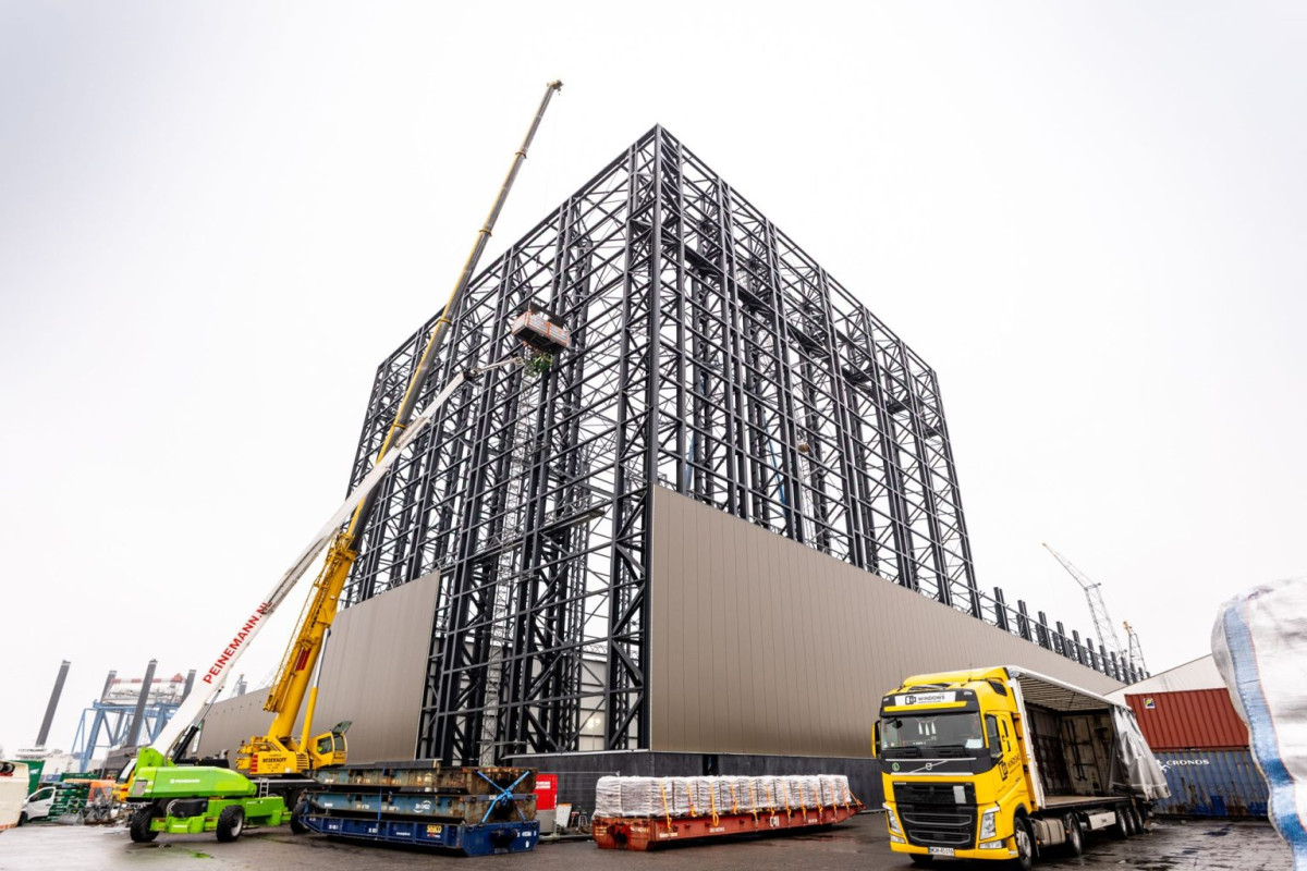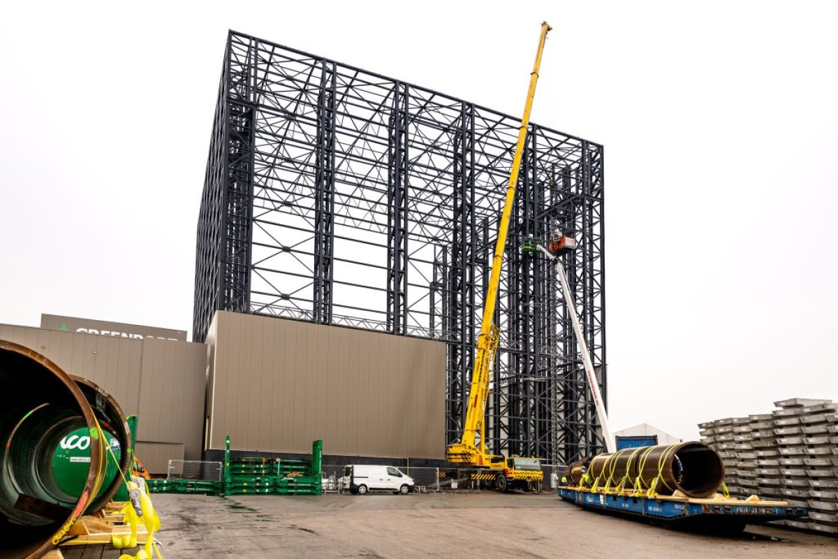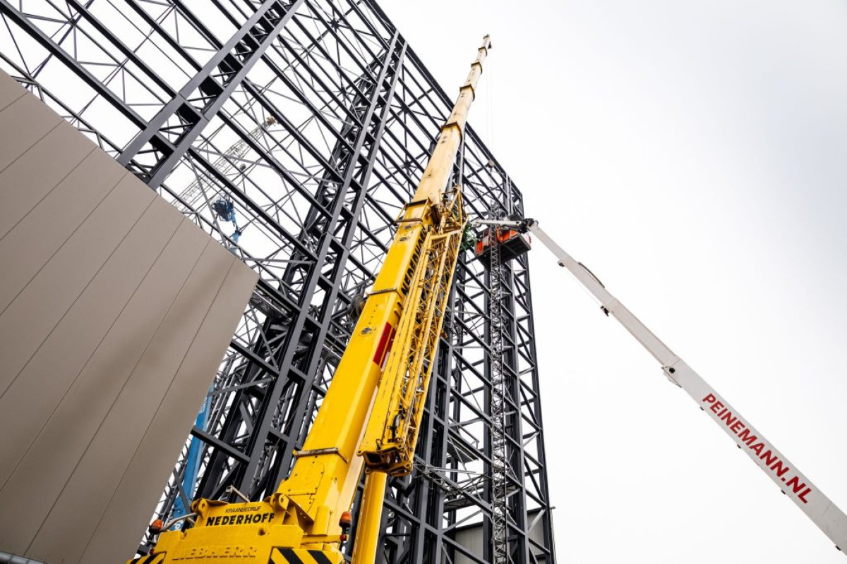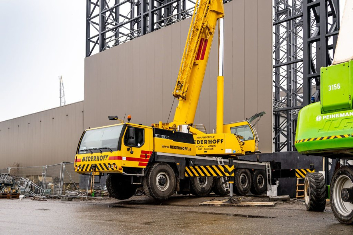 Kraanbedrijf Nederhoff arbeitet an seinem eigenen Standort in Greenport, wo unter der Leitung von Ambytion Construction Management für HEBO eine große Halle für den Schiffbau entsteht. Ihr 100-Tonnen-Mobil-Teleskopkran wird dort für die Montage eines 50 Meter hohen Hubs eingesetzt. Die Teile werden geschickt einzeln nach oben gehoben, damit die Montage sicher und effizient erfolgen kann. Der mobile Teleskopkran hat eine Auslegerlänge von 58 m und ist mit einem 26 m langen Hilfsausleger ausgestattet.