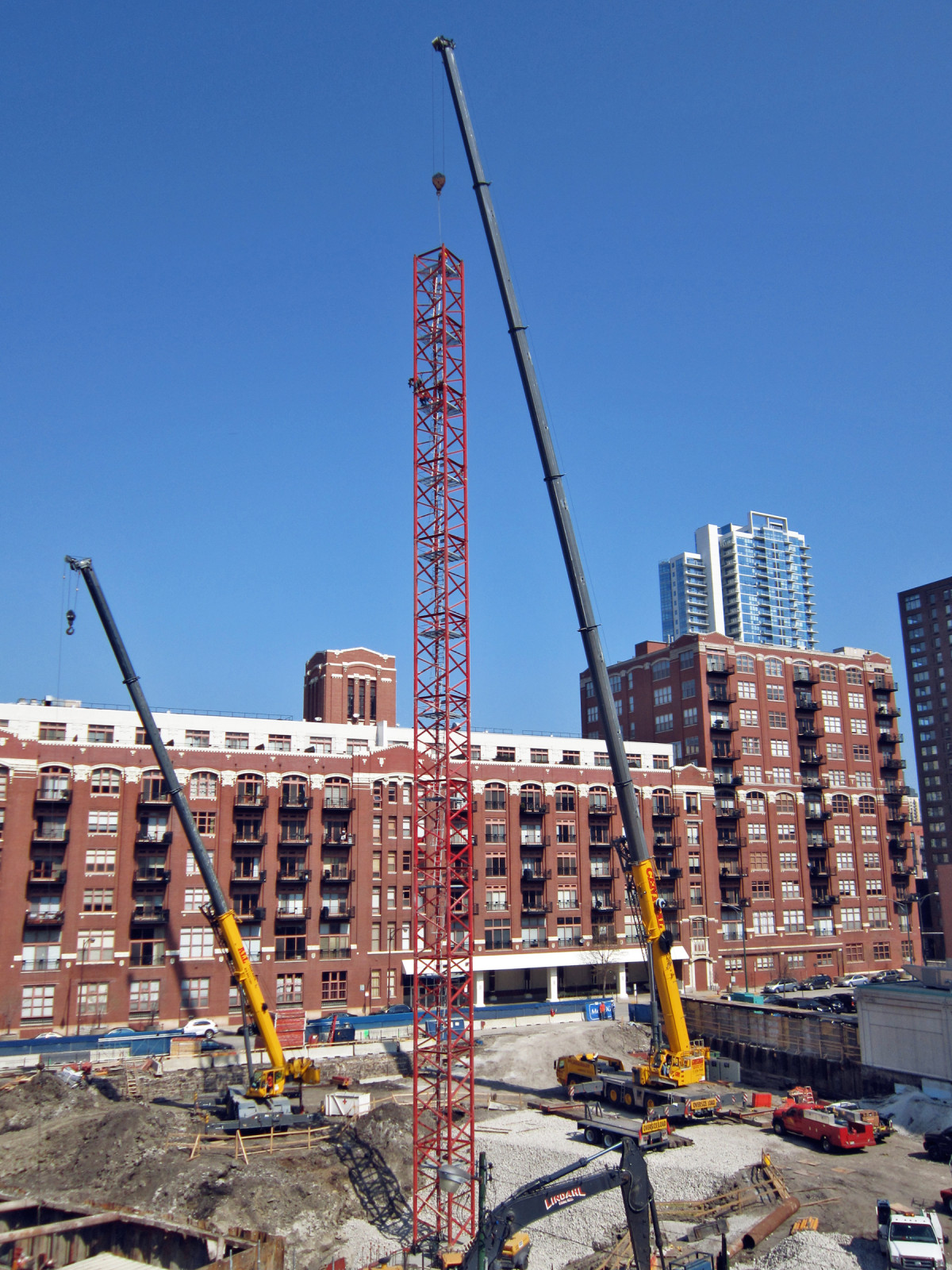 Als die James McHugh Construction Co. die Errichtung eines Potain-Turmdrehkrans für ein 44-stöckiges Wohn- und Parkhaus in der Innenstadt von Chicago, Illinois, plante, war dem Unternehmen klar, dass ein Mobilkran benötigt wurde, der sich leicht manövrieren ließ und Verkehr und andere städtische Hindernisse umfahren konnte. Der Mobilkran musste außerdem über einen ausreichend langen Ausleger verfügen, um die Höhe des Wolkenkratzers zu erreichen. Der Grove GMK6300L – der erste seiner Art in Nordamerika – war die ideale Wahl, um den Potain MD 485 B für die Arbeiten auf dem 111 Millionen Dollar teuren Bauvorhaben vorzubereiten. Paul Treacy, Bauleiter bei McHugh, erklärte, dass der GMK6300L mit seiner Mobilität und der extra langen Auslegerreichweite ideal für städtische Projekte sei. „Die Bauvorschriften in Chicago schreiben vor, dass Krane während der Hauptverkehrszeit nicht auf den Straßen stehen dürfen. Wir wussten, dass wir mit dem GMK6300L den Kran problemlos zur Baustelle bewegen und dort aufstellen konnten, ohne gegen die Verkehrsregeln zu verstoßen“, sagte er. „Ein wesentlicher Grund dafür ist der außergewöhnlich lange Ausleger des GMK6300L. Dadurch benötigten wir für die Montage des Potain keinen Hilfsausleger. Bei anderen Kranen mit vergleichbarer Reichweite muss der Hilfsausleger eingefahren und der Kran neu aufgebaut werden, was viel Zeit kostet.“ Dank des fünfachsigen MEGATRAK-Einzelradaufhängungssystems mit hydropneumatischer Federung und Allradantrieb manövrierte der GMK6300L mühelos durch die Straßen Chicagos. Ebenfalls an Bord ist das elektronische Kranbetriebssystem ECOS, das wichtige Funktionen programmiert und den Kranführer mit Informationen versorgt, sowie EKS 5, das die Hebebedingungen überwacht und eine vollständige grafische Darstellung des Ausfahrprozentsatzes und der Lastdiagramme bietet. Fünf wählbare Abstützpositionen verleihen dem GMK6300L mehr Flexibilität als jedem anderen Kran seiner Klasse. „Wir haben das Glück, die Erfahrung mit dem ersten GMK6300L in Nordamerika zu sammeln“, sagte Treacy. „Dank seines langen Auslegers, der dynamischen Federung und der hohen Tragfähigkeit scheint dieser Maschine kein Projekt zu hoch, zu anspruchsvoll oder zu schwer zu sein.“ Der Turmdrehkran Potain MD 485 B übernimmt die gesamte Hauptarbeitsunterstützung für das Hochhausprojekt. „Die SMDM-Laufkatze am MD 485 B ist ein enormer Vorteil für uns“, so Treacy. „Je nach Hebeanforderungen lässt sich die Seilführung sehr schnell von zwei auf vier Seile umstellen.“ Zum Aufrichten des Turmdrehkrans hob der GMK6300L dessen Mast- und Auslegersegmente mit einem Gewicht zwischen 3.856 kg und 4.082 kg. Der siebenteilige, 80 m lange Ausleger des GMK6300L ermöglicht extrem schwere Lasten, während die Megaform-Formgebung für höhere Steifigkeit sorgt und die Twin-Lock-Verbindung ein leichteres Auslegerdesign ermöglicht, wodurch höhere Lasten gehoben werden können. Ein Grove RT880 Geländekran war ebenfalls an der Montage des Potain-Turmdrehkrans beteiligt und ist weiterhin im Einsatz. Nach der Fertigstellung des Turmdrehkrans MD 485 B übernahm der Geländekran das Betonieren, das Platzieren der Schalung, das Heben von Maschinen und Baumaschinen, das Anheben von Stahlkonstruktionen sowie weitere Baustellenarbeiten. Der RT880 verfügt über einen 39 m langen Ausleger, der mit allen verfügbaren Jib-Anbauteilen auf 70,7 m verlängert werden kann. Alle drei Krane wurden von Central Contractors Service in Chicago, einem Unternehmen der ALL Erection & Crane Rental Corp., an die James McHugh Construction Co. empfohlen und vermietet. Central nutzte seine 3D-Hubplanungstechnologie, um die Montage des Turmdrehkrans auf der Baustelle zu visualisieren und zu planen. Die Arbeiten in Chicago sollen im Februar 2014 abgeschlossen sein.