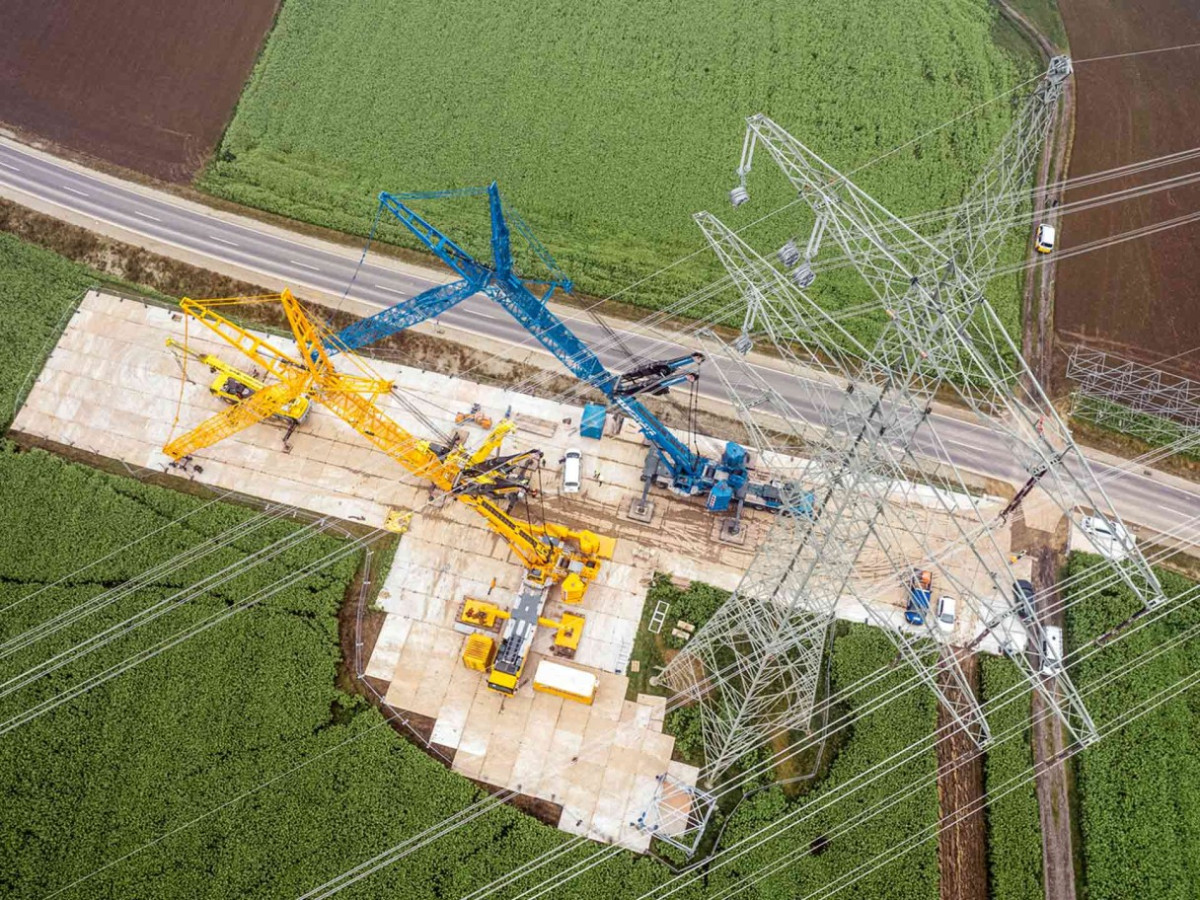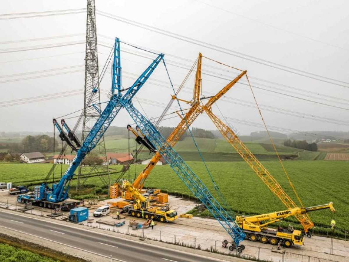 Hochspannung Im vergangenen Herbst hatten sieben große Liebherr-Mobilkrane einen bemerkenswerten Einsatz in Süddeutschland zu erledigen. Die Krane – allesamt vom Typ LTM 1650-8.1 – haben zeitgleich vier gewaltige Masten einer bestehenden Starkstromleitung angehoben.-----------------------------------------Im vergangenen Herbst hatten sieben große Liebherr-Mobilkrane einen bemerkenswerten Einsatz in Süddeutschland zu erledigen. Die Krane – allesamt vom Typ LTM 1650-8.1 – haben zeitgleich vier gewaltige Masten einer bestehenden Starkstromleitung angehoben.Eine logistische Herausforderung ersten Ranges: Nichts anderes war es, was neben schwerer Lasten bei diesem Einsatz nordöstlich von München zu bewältigen war. Eine Herausforderung, die Sven Bauer, Geschäftsführer der AKM Autokranvermietung aus dem Raum München, zu meistern hatte. „Die Synchronhübe hier sind der Abschluss eines Großprojekts, bei dem wir insgesamt 15 Masten dieser Stromtrasse vergrößert haben“, erklärt Bauer, der mit seinen Kranen seit Monaten immer wieder an der Hochspannungsleitung im Einsatz war. „Heute muss ich auf allen vier Baustellen sein, um zu gewährleisten, dass alles reibungslos funktioniert.“ Keine leichte Aufgabe für Bauer, denn „die größte Entfernung zwischen zwei Einsatzorten beträgt knapp 50 Kilometer.“Um bei diesem Projektfinale genügend Kranpower für das orchestrierte Anheben der vier turmhohen Masten bereitzustellen, hatte Sven Bauer kräftige Verstärkung angefordert. Sechs große Liebherr-Mobilkrane vom Typ LTM 1650-8.1 reisten aus Österreich, Baden-Württemberg und sogar aus Norddeutschland an, um den baugleichen AKM-Großkran von Bauer zu unterstützen. Die Firmen Prangl, Felbermayr, Thömen, Hüffermann, MSG und Wiesbauer waren auf den bayerischen Feldern mit von der Partie. Auf drei Baustellen wurden die 700-Tonnen-Krane paarweise eingesetzt, um die nötige Hubkraft aufzubringen. Immerhin galt es, bis zu 95 Tonnen schwere Lasten aus Strommasten und den daran hängenden Hochspannungsleitungen auf bis zu 104 Meter Hakenhöhe zu ziehen und dort sicher zu halten. Und das teilweise tagelang.Zwei Nächte lang am Haken.Am längsten hatten die beiden Geräte von Wiesbauer und MSG mit ihrer gemeinsamen Last an den Hakenflaschen auszuharren. Über zwei Nächte hinweg hingen Mast und Leitungen an der Traverse der Krane. Rund 35 Meter des unteren Gitterturmes wurden hier komplett neu aufgebaut. In den Großkranen wechselten sich die Kranfahrer in ihren Kabinen ab, denn die schwebend wirkenden Strommasten konnten natürlich nicht über Nacht unbeaufsichtigt bleiben. Aus Sicherheitsgründen führten die rund 40 Industriekletterer ihre Montagearbeiten nur bei Tageslicht und nach Auflösung des meist dichten Bodennebels durch. Auf allen vier Baustellen wurden große, vormontierte und bis zu 30 Tonnen schwere Mastteile von den kleineren Kranen – allesamt Liebherr-Geräte mit Traglasten von 90 bis 250 Tonnen – unter den hängenden Masten eingebaut. „Hier mussten wir oft in ziemlich flachem Winkel mit angehängter Last teleskopieren, um die Bauteile unter die angehobenen Strommasten zu bringen“, erklärt Sven Bauer.20.000 Stahl- und Aluplatten für festen Untergrund Eine imposante Zahl unterstreicht eindrucksvoll die eingangs erwähnte und aufwendige Logisitk: 20.000. Etwa so viele Aluminium- und Stahlplatten waren nötig, um die vier Einsatzorte auf den Ackerflächen für die Krane erreichbar und nutzbar zu machen. „Aufgrund der jüngsten Niederschläge hatten wir sehr matschige Böden und damit einen enormen Aufwand, um sichere Fahrwege und Aufstellflächen für die Krane zu schaffen“, erklärt Sven Bauer. „Teilweise waren 25 Quadratmeter mit Lastverteilerplatten für eine einzige Kranstütze erforderlich. Zudem hatten wir zum Teil abschüssiges Gelände und mussten dort die Abstützungen stark unterbauen.“Liebherr-Service war sichergestellt Als am dritten Tag der letzte der vier Strommasten abgesetzt wurde, zeigte sich Sven Bauer erleichtert: „Die akribische Vorbereitung hat sich gelohnt. Auch dank des hervorragenden Services von Liebherr konnten wir diesen Großeinsatz termingerecht abschließen. Das war wichtig, um die Leitungen innerhalb der geplanten Frist wieder unter Strom zu setzen. Aus diesem Grund hatte unser Kunde auch klare Anforderungen hinsichtlich der eingesetzten Krane: Es sollten nur Maschinen zum Einsatz kommen, bei denen ein schneller und zuverlässiger Service garantiert ist. Deshalb arbeiten wir bei diesem Projekt ausschließlich mit Liebherr-Mobilkranen und nicht mit Geräten anderer Hersteller, von denen wir ohnehin nur einige wenige besitzen. Tatsächlich hatten wir einen Defekt an einem Hydraulikschlauch. Der Servicetechniker von Liebherr war aber schnell vor Ort und hat den Schaden rasch behoben.“