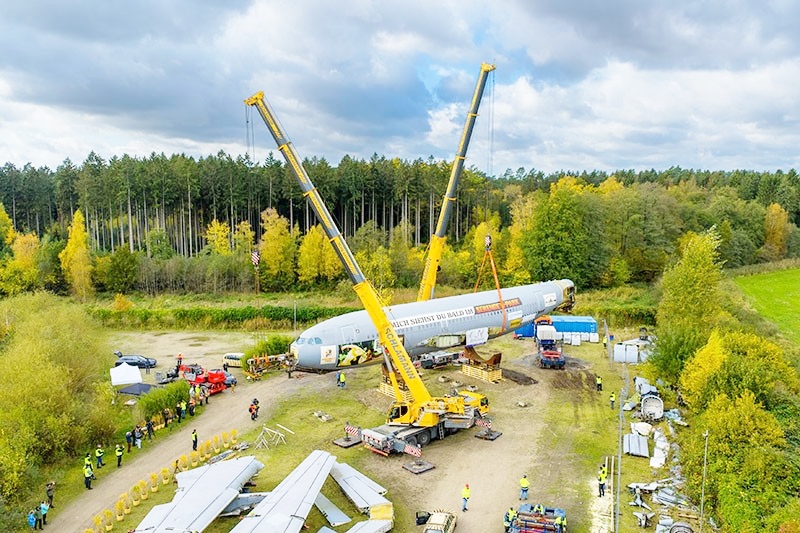 Airbus A310 wird zur Attraktion: Liebherr-Mobilkrane im Serengeti-Park im Einsatz • LTM 1300-6.3 und LTM 1250-5.1 im Tandem-Einsatz • Flugzeug wird zu Restaurant umgebaut Zwei Liebherr-Mobilkrane der Schlamann Autokrane GmbH aus Nienburg/Weser haben im Serengeti-Park einen ausgemusterten Airbus A310 von Schwertransportfahrzeugen entladen und auf vorbereitete Lager gesetzt. Das Flugzeug soll künftig als außergewöhnliche Attraktion dienen und den Freizeit- sowie Safaripark bereichern. Für den anspruchsvollen Hub des rund 49 Tonnen schweren Jets setzte das Team auf einen Tandemhub: Der LTM 1300-6.3 übernahm die Hauptlast von 32,5 Tonnen bei einer Ausladung von bis zu 22 Metern und wurde dafür mit 77 Tonnen Ballast gerüstet. Der LTM 1250-5.1 trug die verbleibenden 16,5 Tonnen und benötigte lediglich 42 Tonnen Ballast. „Das ist ein sehr spannender Auftrag“, sagt Torsten Schlamann, Geschäftsführer der Schlamann Autokrane GmbH. „Das Flugzeug wurde am Flughafen Langenhagen verladen und hier wieder abgeladen. Der LTM 1300-6.3 ist seit März im Einsatz und unser stärkster Mobilkran. Er überzeugt mit einem 90 Meter langen Teleskopausleger. Wir haben bereits viele Einsätze absolviert – die Fahrer sind froh mit dem neuen Kran, und ich bin zufrieden mit der Entscheidung, ihn zu kaufen.“ Ein Flugzeug als Restaurant Der Serengeti-Park verbindet Safari-Erlebnis mit Freizeitpark-Action. Mit dem Airbus A310 entsteht nun eine weitere Attraktion. Dirk Jasper, Bereichsleiter Projekte im Serengeti-Park, erklärt: „Vor fünf Jahren hatten wir die verrückte Idee, ein Flugzeug zum Restaurant umzubauen. Vor vier Jahren haben wir eines ersteigert. Es gab Hindernisse wie behördliche Auflagen und Genehmigungen, doch jetzt sind wir froh, dass das Flugzeug hier ist. Die Eröffnung des Restaurants ist für September 2026 geplant.“ Schlamann Autokrane betreibt 21 Mobilkrane – überwiegend von Liebherr. Neben Mobilkranen vermietet das Unternehmen mit rund 90 Mitarbeitenden an vier Standorten auch Arbeitsbühnen und Stapler. Der Fuhrpark umfasst etwa 250 Geräte und Maschinen.
