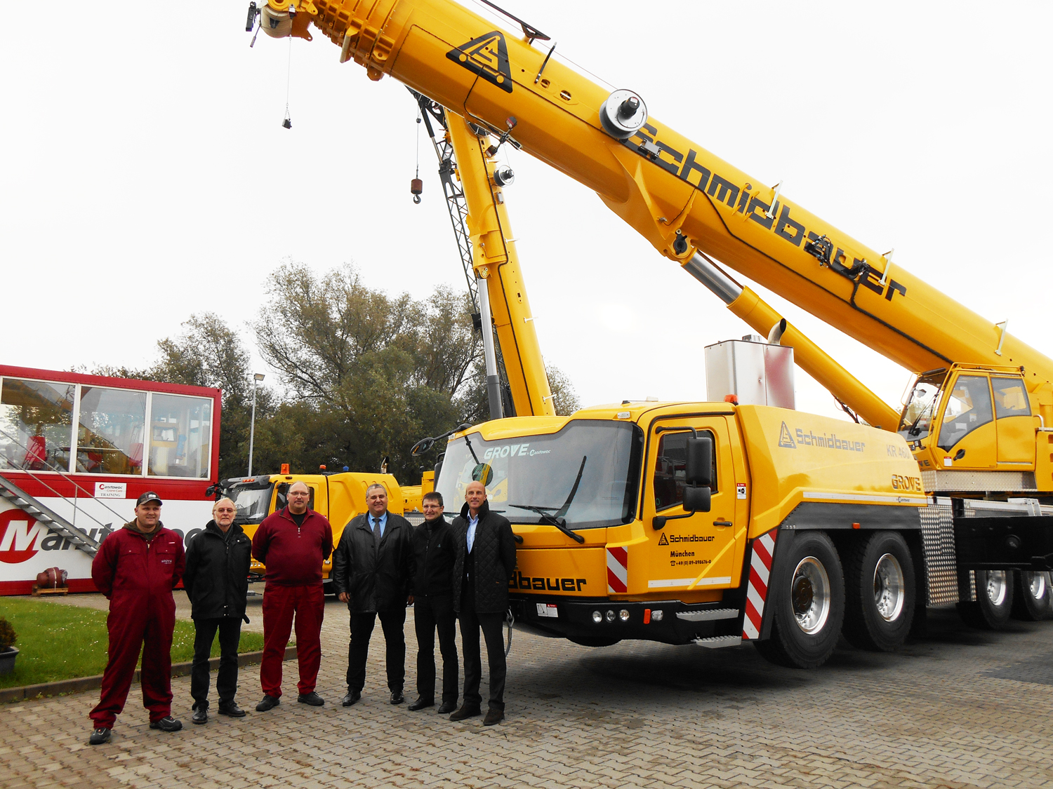 Von links nach rechts: Florian Horn, Dieter Moser, Norbert Brandt von Schmidbauer mit Dieter Popp von Manitowoc sowie Hermann Setzmüller und Werner Schmidbauer von Schmidbauer----------------------------------------------------------------Deutschlands größter Kranbetreiber, die Schmidbauer Gruppe, hat ihre Flotte um zwei Grove-Geländekrane erweitert. Das Unternehmen nahm Ende 2013 einen GMK6300L mit 300 Tonnen Tragfähigkeit und einen GMK4100L mit 100 Tonnen Tragfähigkeit in Betrieb. Beide Krane wurden umgehend in Betrieb genommen. Schmidbauer entschied sich für die beiden Grove-Krane, da sie eine beeindruckende Tragfähigkeit mit außergewöhnlicher Reichweite verbinden und über gewichtssparende Merkmale verfügen, die den strengen deutschen Straßenverkehrsvorschriften entsprechen. Werner Schmidbauer, CEO des Unternehmens, erklärt: „Grove stellt nicht nur robuste Krane mit sehr langen Auslegern her, sondern entwickelt auch innovative Lösungen zur Gewichtsreduzierung, wodurch die Krane leichter in ganz Deutschland transportiert werden können.“ Er fügt hinzu: „Unsere beiden neuen Krane sind mit Aluminiumrädern ausgestattet. Dadurch können wir mehr Ausrüstung und Gegengewicht zu den Baustellen transportieren, was Zeit und Aufwand spart. Sie sind eine hervorragende Ergänzung unserer Flotte.“ Grove ist der einzige Hersteller von Mobilkranen, der Aluminiumräder serienmäßig anbietet. Beim sechsachsigen GMK6300L spart dies bis zu 600 kg – eine signifikante Gewichtsreduzierung, die es den Betreibern ermöglicht, mit mehr Sonderausstattung oder Gegengewicht auf deutschen Straßen zu fahren. „Die Straßenverkehrsordnung in Deutschland wird immer strenger, daher wünschen sich unsere Kunden leichtere Krane, die dennoch die gleiche Tragfähigkeit bieten“, ergänzt Dieter Popp, regionaler Vertriebsleiter bei Manitowoc. „Unsere gewichtssparenden Räder verschaffen unseren Grove-Kranen einen klaren Wettbewerbsvorteil.“ Die neuen Grove-Krane von Schmidbauer waren sofort im Einsatz. Der erste Einsatz des GMK4100L führte ihn in eine Papierfabrik in Plattling, wo er eine Antenne von einem Silo demontierte. Mit seinem 60 m langen Ausleger und einem 6,3 t Gegengewicht bewältigte der Kran die Aufgabe mühelos. Der GMK4100L ist in der Schmidbauer-Niederlassung in Deggendorf (Südostdeutschland) stationiert, während der GMK6300L am Hauptsitz des Unternehmens in Unterschleißheim bei München seinen Dienst verrichtet. Der Grove GMK6300L setzt weiterhin Maßstäbe in der globalen Mobilkranbranche. Seit seiner Markteinführung Ende 2010 wurden weltweit über 150 Einheiten verkauft. Sein siebenteiliger, 80 m langer Ausleger ist der längste seiner Klasse und ermöglicht kraftvolle Hübe ohne Hilfsausleger. Der GMK 4100L ist ein vierachsiger 100-Tonnen-Kran mit einem 60 m langen Ausleger, der mit einem Hilfsausleger auf 77 m verlängert werden kann. Die 1932 gegründete Schmidbauer Gruppe betreibt eine Flotte von 250 Mobilkranen mit Tragfähigkeiten bis zu 1.250 Tonnen. Das Unternehmen ist an 20 Standorten in ganz Deutschland vertreten und beschäftigt 600 Mitarbeiter.