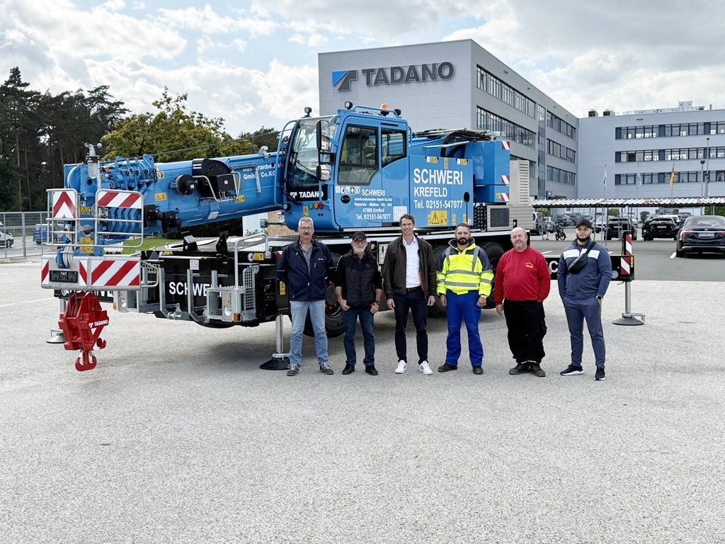 Sales Manager Helge Prüfer von Tadano mit Werkstattleiter Niko Prawez, Geschäftsführer Leonhard Zerni, den Kranfahrern Sergii Bigus und Fadil Klein sowie Disponent Serhii Nechyporenko (v.l.)