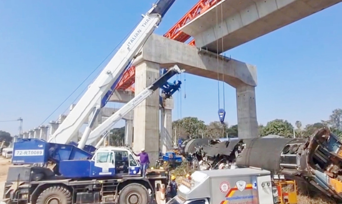 28 Menschen sind heute Morgen um 09:13 Uhr Ortszeit in Nakhon Ratchasima, Thailand, gestorben, und 64 weitere sollen verletzt worden sein, als eine Montagekran auf einen fahrenden Zug mit rund 200 Passagieren – überwiegend Schüler und Pendler – stürzte. Jüngste verletzte Person soll ein Jahr alt sein. Der Zug, der westlich von Bangkok nach Ubon Ratchathani fuhr, passierte Ban Thanon Khot in der Provinz Nakhon Ratchasima, nordwestlich der Hauptstadt, mit einer Geschwindigkeit von rund 120 km/h, als der Kran in die Mitte des zweiten Wagens fiel und diesen buchstäblich in zwei Hälften schnitt; weitere Wagen entgleisten und fingen Feuer. Die meisten Opfer befanden sich im zweiten Wagen. Der Kran arbeitete an dem Abschnitt Lam Takhong-Sikhio des 4-Milliarden-Pfund schweren Hochgeschwindigkeitsbahnprojekts, das Bangkok bis Kunming in China bis 2028 verbinden soll. Das Projekt wird von der italienisch-thailändischen Entwicklungsfirma ITD – einem der größten Auftragnehmer Thailands – und der China Railway Engineering Corporation (CREC) betreut. Die ITD ist für den Abschnitt verantwortlich, in dem der Vorfall geschah. Thailands Premierminister Anutin Charnvirakul verfasste eine Stellungnahme, in der stand: „Unfälle wie dieser können nur durch Nachlässigkeit, übersprungene Schritte, Abweichungen vom Design oder die Verwendung falscher Materialien entstehen. Wir müssen untersuchen, ob Baufehler oder Abweichungen von richtigen Verfahren vorliegen.