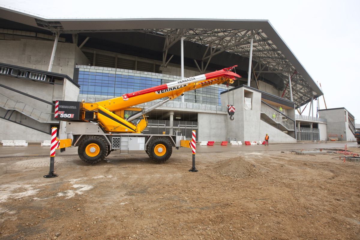 Der Grove RT550E ist der neueste Manitowoc-Kran, der auf der Baustelle des legendären Fußballstadions in Lyon, Frankreich, zum Einsatz kommt. Er ergänzt eine Flotte von Potain-Kranen, die beim Bau des Stade des Lumières (Stadion des Lichts) mit 60.000 Plätzen – der neuen Heimstätte von Olympique Lyonnais, einem der erfolgreichsten Fußballvereine Frankreichs – helfen. Im Stadion finden Spiele der UEFA-Europameisterschaft 2016 statt, dem zweitgrößten Fußballturnier der Welt in Frankreich. Der RT550E, im Besitz des italienischen Vermietungsunternehmens Vernazza Autogru, ergänzt acht MD 485 B M20 und zwei MD 365 B L16. Der Grove RT550E ist ein Geländekran mit einer Tragfähigkeit von 45 Tonnen und bietet mit 39 Metern die höchste Tragfähigkeit und den längsten Ausleger seiner Klasse. Davide Camperi, Gebietsverkaufsleiter für Mobilkrane bei der Manitowoc Crane Group Italy, erklärte, der RT550E sei aufgrund seiner Arbeitsgeschwindigkeit, Stärke und Präzision auf der Baustelle ausgewählt worden. „Auf Industriegeländen werden Krane benötigt, die ein breites Einsatzspektrum abdecken können“, sagte er. „Dank seiner Stärke und Größe ist der RT550E eine äußerst vielseitige Maschine, die sich ideal für die schnelle und effiziente Erledigung verschiedenster Aufgaben eignet.“ Mit einer Länge von 12 m und einer Breite von 2,55 m ist der kompakte Grove RT550E ideal für Arbeiten, die wenig Platz und eine hohe Hubkraft erfordern. Die Maschine verfügt über das neue standardisierte Kransteuerungssystem (CCS) mit benutzerfreundlicher Oberfläche, zwei vertikal montierten Grafikdisplays für optimale Sicht und einem Drehregler für eine intuitive Kransteuerung und Dateneingabe. Das System beinhaltet außerdem den integrierten Auslegerkonfigurationsmodus, mit dem der Bediener schnell und einfach die optimale Auslegerkonfiguration für den jeweiligen Hub auswählen kann. So kann der Bediener mehr Hübe in kürzerer Zeit durchführen – ohne Kompromisse bei der Qualität. Die Manitowoc-Krane waren auf der Baustelle nahezu ununterbrochen im Einsatz. Zu ihren vielfältigen Aufgaben gehörte unter anderem das Heben eines Großteils der 7.000 Tonnen Stahl, die für den Stadionbau benötigt wurden. Der RT550E transportierte hauptsächlich Material und montierte Stahlkonstruktionen. „Der Kran übernahm die typischen Aufgaben eines Geländekrans, wie das Heben und Tragen von Lasten sowie allgemeine Transportarbeiten auf der Baustelle“, so Camperi. „Dank seines langen Auslegers und seiner hohen Tragfähigkeit ermöglichte er darüber hinaus Montagearbeiten in Höhen, die normalerweise nur mit zwei- und dreiachsigen Geländekranen erreicht werden. Besonders geschätzt wurde bei Montagearbeiten in der Höhe, dass unser CCS-System es dem Kranführer erlaubt, die elektronischen Steuerungen für spezifische Anforderungen umzuprogrammieren und so präzisere Ergebnisse zu erzielen.“ Der Generalunternehmer des Projekts, der französische Baukonzern Vinci, mietete den Kran RT550E vom italienischen Kranspezialisten Vernazza Autogru. „Der RT550E ist eine einzigartige Maschine mit einem 39 Meter langen Teleskopausleger und lässt sich schnell und einfach aufbauen“, so Diego Vernazza, Inhaber von Vernazza Autogru. „Dank seiner einfachen Bedienung und des günstigen Preises war der RT550E eine hervorragende Ergänzung für die Baustelle.“ Das Stade des Lumières erstreckt sich über eine Fläche von 56.000 m² und ist Teil eines größeren, 450 Millionen Euro teuren Bauprojekts auf 50 Hektar. Zum Gelände gehören ein Trainingszentrum, Hotels, Bürogebäude, ein Freizeitzentrum und mehrere zusätzliche Fußballplätze. Das Stade des Lumières, das das alte Gerland-Stadion ersetzt, wurde Ende 2015 fertiggestellt.