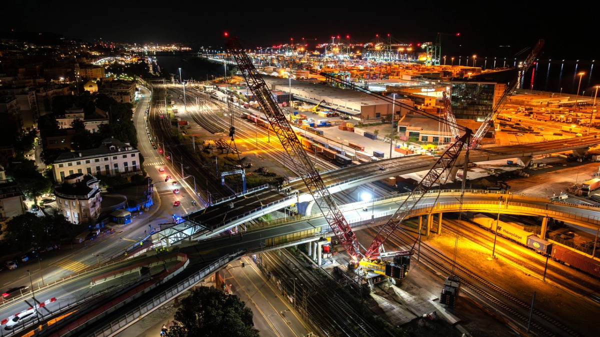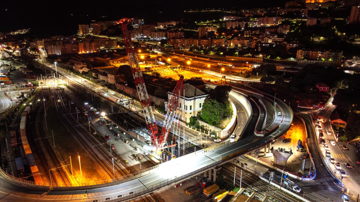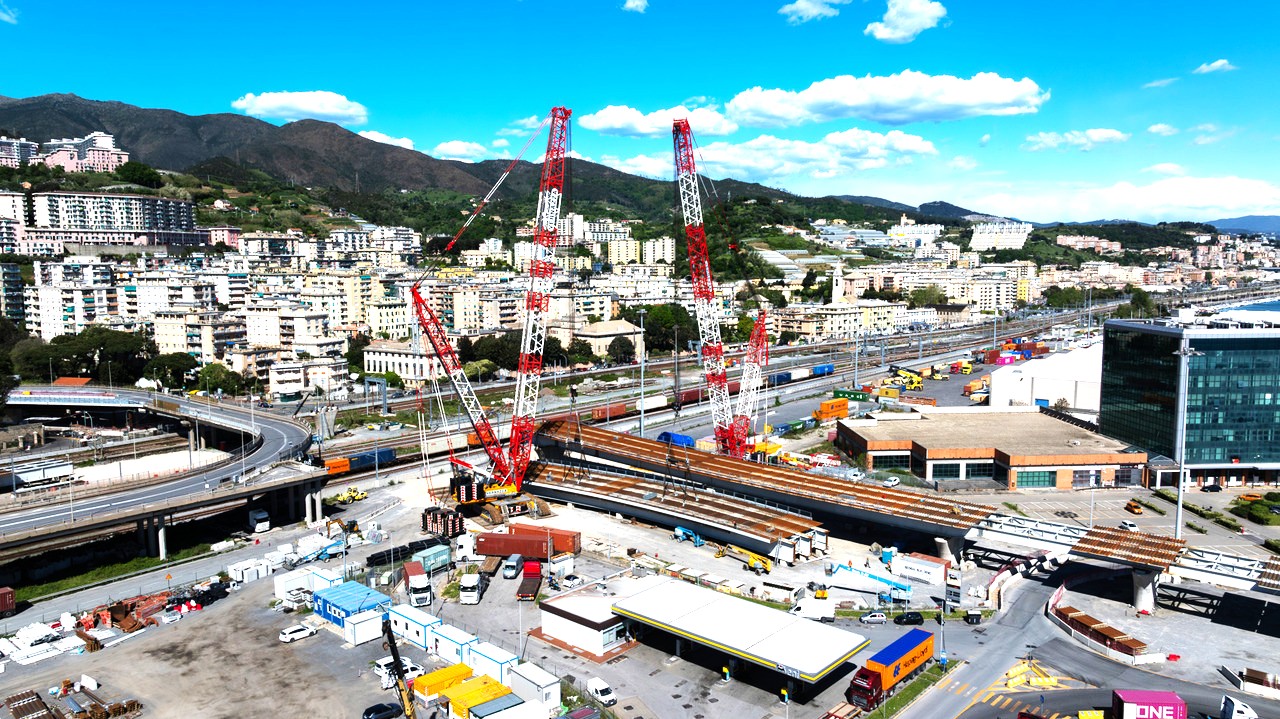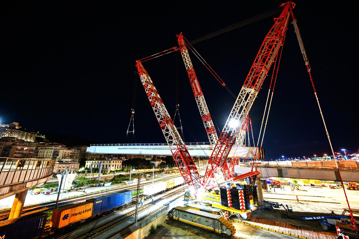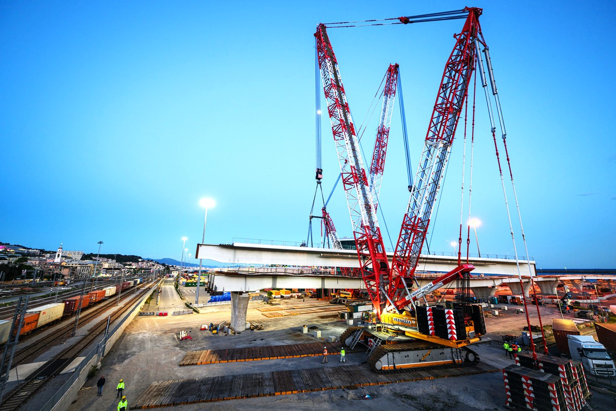 Wenn es darum geht, besonders schwere Lasten zu heben und zu bewegen, verlässt man sich beim italienischen Krandienstleister Vernazza Autogru gerne auf die leistungsstarken Gittermast-Raupenkrane von Tadano – so auch beim Hub zweier 500 und 290 Tonnen schwerer Elemente für eine Brückenkonstruktion, die Vernazza in der Werft von Porto di Prà für das Bauunternehmen Fincantieri eingehoben hat. Bei den Lasten handelte es sich um Brückensegmente in Verbundbauweise mit stählernen Hauptträgern und einer darüber liegenden Fahrbahnplatte aus Beton. Diese mussten mit großer Präzision auf Stützpfeiler gehoben werden. „Für die anspruchsvollen Hübe brauchten wir Krane, die nicht nur in der Lage waren, solch schwere Lasten zu heben, sondern diese auch noch schwebend verfahren konnten. An unseren beiden Tadano Gittermast-Raupenkranen führte daher bei diesem Job kein Weg vorbei“, erklärt Marco Galli, der dieses Projekt verantwortete. Doch zunächst mussten beide Krane vom Vernazza Hauptsitz in Vado Ligure auf die Bauastelle in Porto di Prà transportiert und dort aufgebaut werden. Hierfür benötigten die Kranprofis von Vernazza lediglich acht Tage für die Montage des CC68.1250-1 und nur fünf für den CC 38.650-1. Auch die einsatzbedinge Umplatzierung des CC 68.1250-1, während der Arbeiten konnte ohne Verzögerungen durchgeführt werden. Dabei kam uns das optimierte Rüstkonzept der beiden Tadano CC Krane sehr entgegen, sodass wir auch diese Herausforderung problemlos meistern konnten“, berichtet Marco Galli, der an den Tadano CC Gittermast-Raupenkranen darüber hinaus vor allem deren große Zuverlässigkeit und ihre besonders feinfühlige Manövrierbarkeit schätzt.------------------------- Komplexe Hübe über viel befahrenen Verkehrswegen Beides war bei diesem Job gefragt. Denn die Hubarbeiten mussten in vorgegebenen Zeitfenstern im Zufahrtsbereich des Hafens durchgeführt werden, ohne dass dabei der dort herrschende starke Verkehr über das minimal notwendige Maß beeinträchtigt werden durfte. Konkret musste Vernazza die Hübe an diesem Verkehrskontenpunkt über bestehende Brücken, die Bahnstrecke Genua-Ventimiglia sowie über die viel befahrene Staatsstraße Aurelia hinweg durchführen. Die Verkehrswege sollten dabei natürlich nur möglichst kurzzeitig gesperrt werden – Verzögerungen jeder Art waren also unter allen Umständen zu vermeiden.------------------------ Deshalb hatte das Team jeden Schritt dieses Jobs akribisch geplant: Für das Einsetzen des 500 Tonnen schweren Brückenelements war ein Tandemhub angesetzt, während das 290-Tonnen-Element vom CC 68.1250-1 alleine zu bewältigen war. Dieser wurde in SSL-Konfiguration mit 72 Meter Ausleger und 450 Tonnen Superlift Gegengewicht gerüstet; der CC 38.650-1 ebenfalls in SSL-Konfiguration mit gleich langem Ausleger und 325 Tonnen Superlift Gegengewicht. Das 500-Tonnen-Element hoben und verfuhren beide gemeinsam mit einem Arbeitsradius von 50 Metern bei einer Höhe von sieben Metern; das 290-Tonnen-Element setzte der CC 68.1250-1 bei einem Radius von 41 Metern auf einer Höhe von 9 Metern ein. „Zum Heben und Einsetzen der 500-Tonnen-Plattform mit beiden Kranen haben wir ein achtköpfiges Team eingesetzt, dem neben den beiden Kranführern auch sechs Supervisoren und Signalmänner angehörten, während wir für den Hub der kleineren Last alleine mit dem CC 68.1250-1 nur fünf Personen brauchten“, beschreibt Marco Galli den Personaleinsatz.--------------------------- Perfektes Zusammenspiel von Menschen und Maschinen Insgesamt war das Vernazza Team bei diesem Projekt vier Monate vor Ort – und lag damit perfekt im vorgesehenen Zeitrahmen: „Dass alles wie geplant ablief, ist nicht nur der professionellen Planung und der routinierten Arbeit unseres Teams zu verdanken, sondern auch der Zuverlässigkeit unserer beiden Tadano Krane, die sich auch bei diesem Job wieder einmal bestens bewährt haben“, resümiert Marco Galli zufrieden.