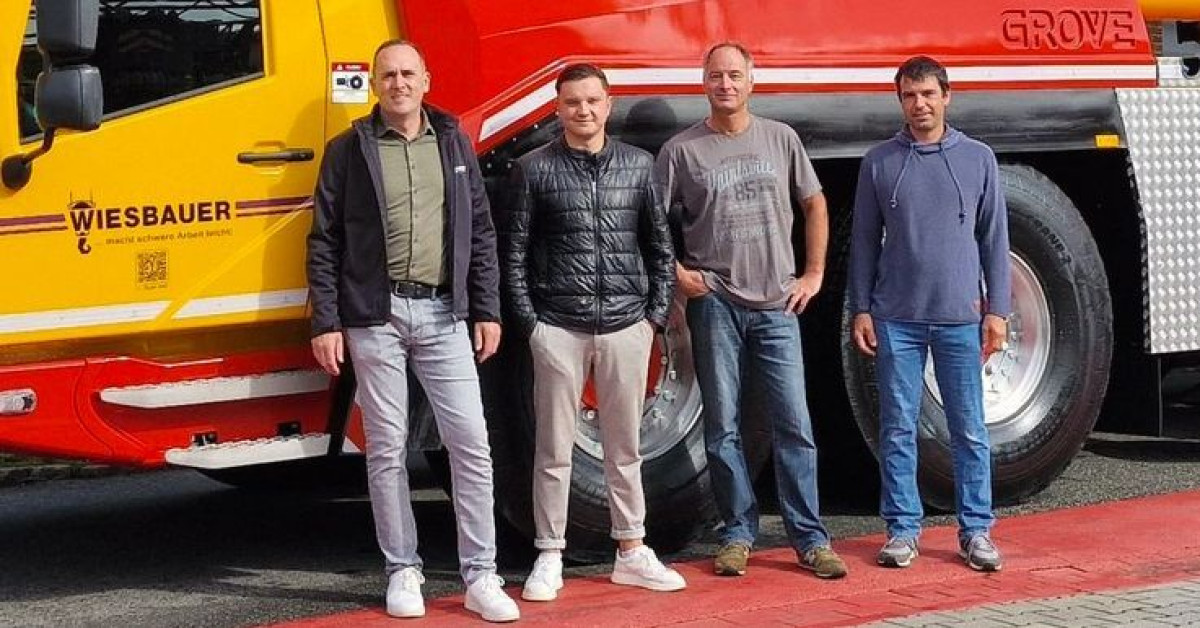 vl-nr Lukas Brämer von der KranAgentur Werner mit Sacha Weitzel, Jörg Haasner und Jan Schöneck von Wiesbauer (v.l.) In der Mannheimer Niederlassung gibt es nur Grove Krane (6).